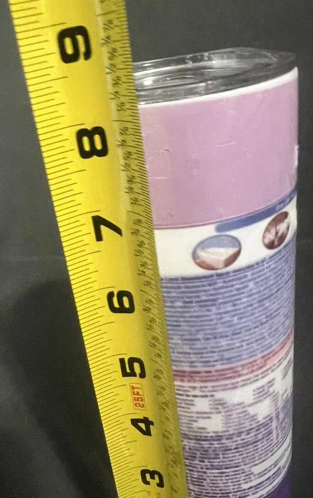 This 20oz stainless steel tumbler is perfect for on-the-go drinks. The purple lysol wrap design adds a fun touch to your daily routine. Measuring at 8 inches in height, it's the perfect size for your morning coffee or afternoon smoothie. Crafted with high-quality materials, this tumbler is durable and long-lasting. Its sleek design is perfect for any setting, whether you're at the office or out for a run. With a capacity of 20oz, you can stay hydrated throughout the day without needing to constantly refill your cup. Add this customized tumbler to your collection today!