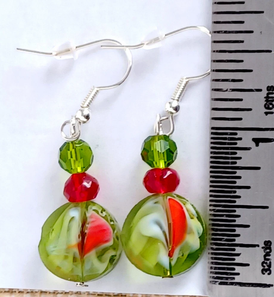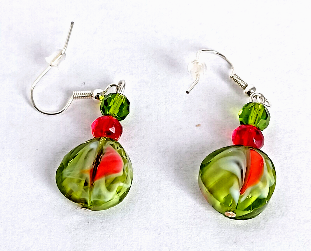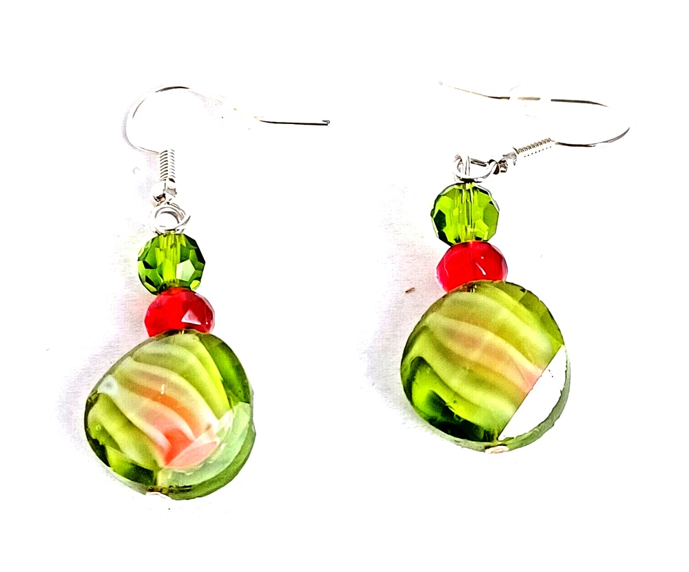 Add a pop of color to your jewelry collection with these stunning multicolor glass earrings. The round, cut faceted beads feature a beautiful green, red, and white swirl center, adding a touch of beauty. The dangle/drop style with hook closure makes them easy to wear for any occasion. Made of high-quality glass material, these earrings are sure to last for years to come.