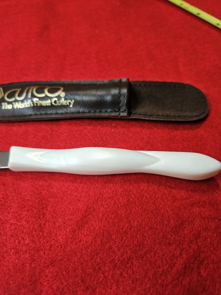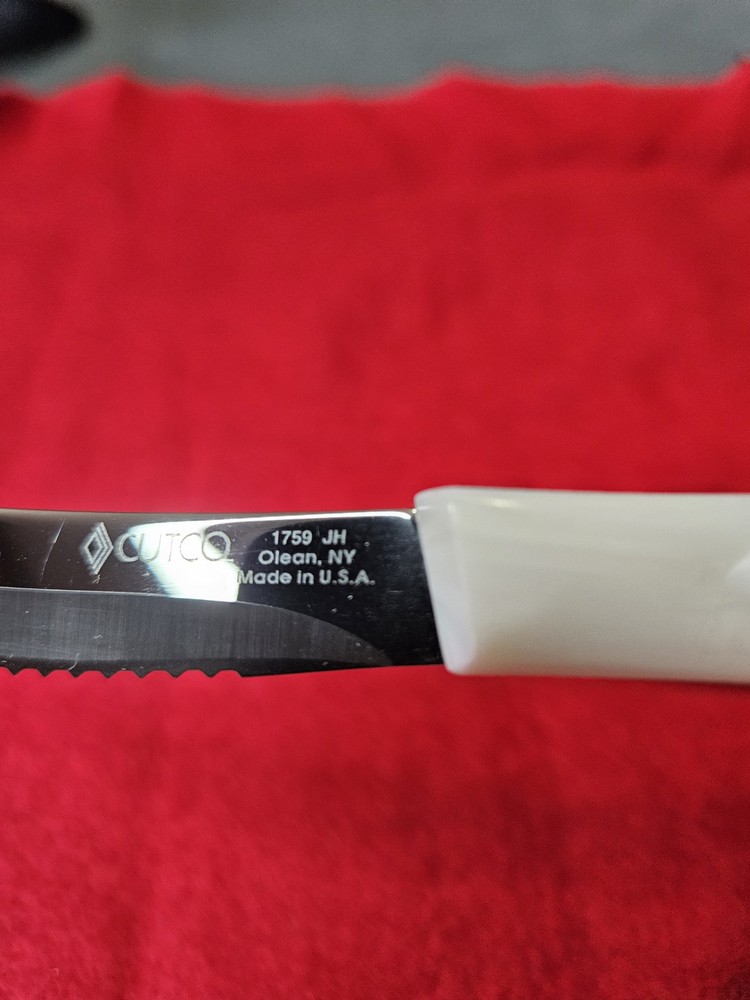 Type:Table Knifegtin13:Does Not ApplyMaterial:Stainless SteelSeller Notes:“Real Nice”Brand:CutcoBlade Edge:StraightBlade Length:3 inNumber of Items in Set:1Handle Material:CompositePersonalize:NoFeatures:Easy Clean, With Blade CoverColor:WhiteUPC:Does Not ApplyCountry/Region of Manufacture:United StatesMPN:1759 JHFood Compatibility:UniversalSet Includes:Serrated Knife