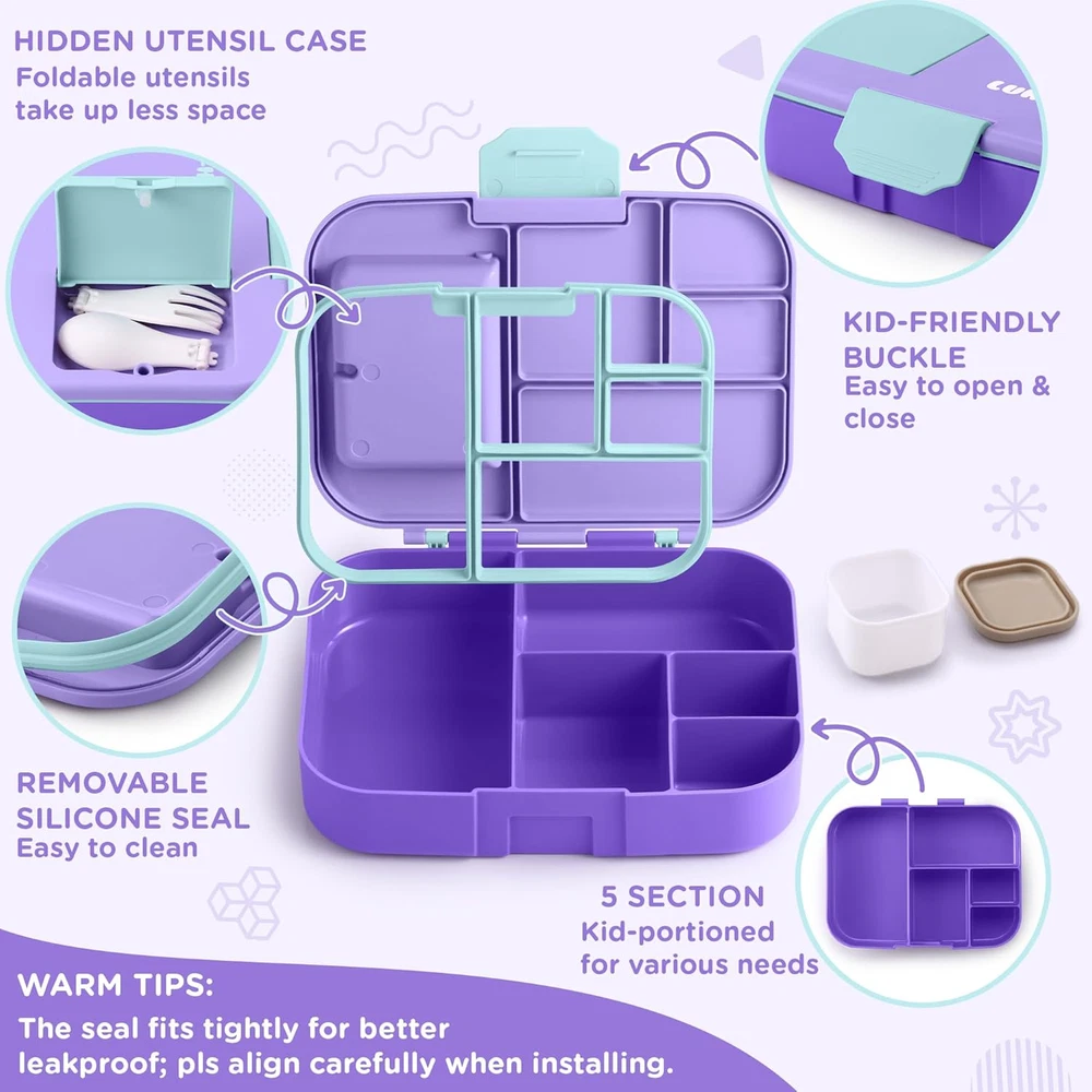 Kawaii Lunch Box Set for Kids: This bento box set includes a 1300ml (44oz/5.5-cup) lunch box, a sauce cup, a foldable fork and spoon, and a beautifully designed gift box—everything your child needs for school or outings! Vibrant Design for Fun Mealtimes: With bold purple and blue colors, this lunch box makes mealtime exciting! The five compartments are perfect for colorful, balanced meals, encouraging your child to try new foods and share with friends—making every meal an adventure! Microwave & Dishwasher Safe with Removable Silicone Seal: Reminder: When microwaving, keep the lid loose to allow steam to escape. The removable silicone seal is designed for easy cleaning but may require a bit of patience or help from parents when reinstalling to ensure it fits snugly for leak-proof protection. Certified Child-Safe & Kid-Friendly: Safety is our top priority! This Lunchable Container is CPC-certified, ensuring it is non toxic. The secure clasp and easy-to-carry handle makes it simple for kids to open, close, and take on the go. Plus, it fits easily into most standard lunch bags. We’re Here to Help: If you notice any damage or missing parts, please don't hesitate to let us know. We're committed to resolving any issues quickly and ensuring your experience with our product is a positive one. Bento Box for Kids, Cute Lunch Box Containers for Girls, Toddler School Lunch Box for Daycare with 5 Compartments, Kids Lunchbox Container with Utensils and Sauce Cup, Purple