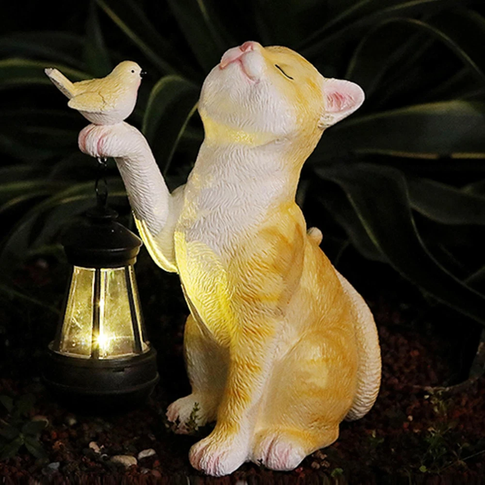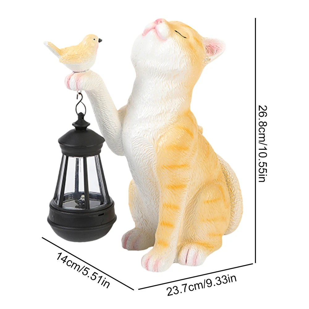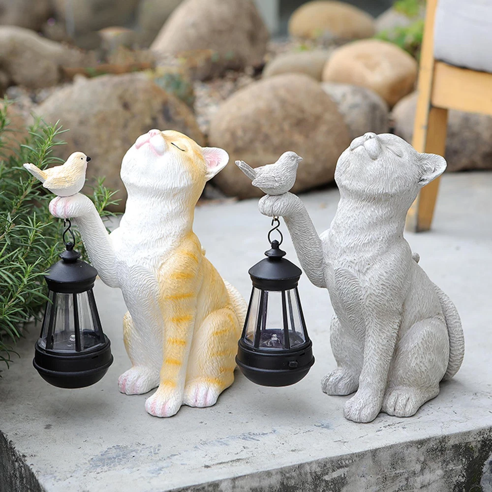 Cute Cat Statue with Solar Lantern Eye-Catching Garden Sculpture Decor