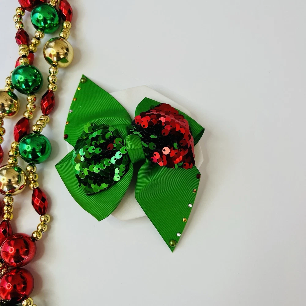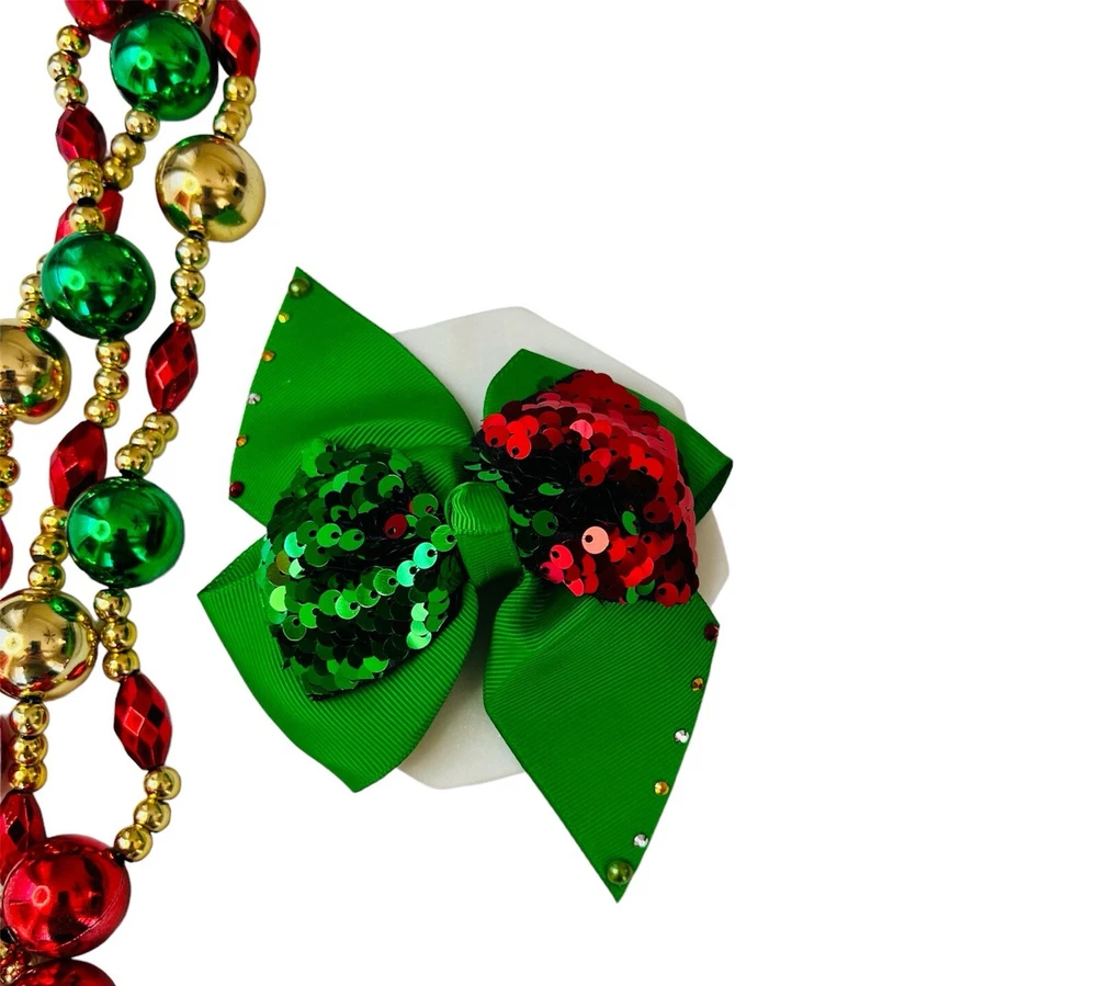 Adorable Christmas Sequins Hair Bow for Girls and Toddler. Handmade New This Gorgeous Hair Bow is made from Green Grosgrain Ribbons. Attached to an alligator clip. The Bow measure approximately is 4.5 inch of length and 3 inch de height. Beautiful and Colorful !!! Christmas Hair Bow is a chic accessory to wear Christmas, School, Party or Any Occasion. Wonderful Gift for the Family and Friends, Birthdays, Holidays Handmade with Love No Pets. Free Smoke Home. … Thank you for Supporting my Small Business!