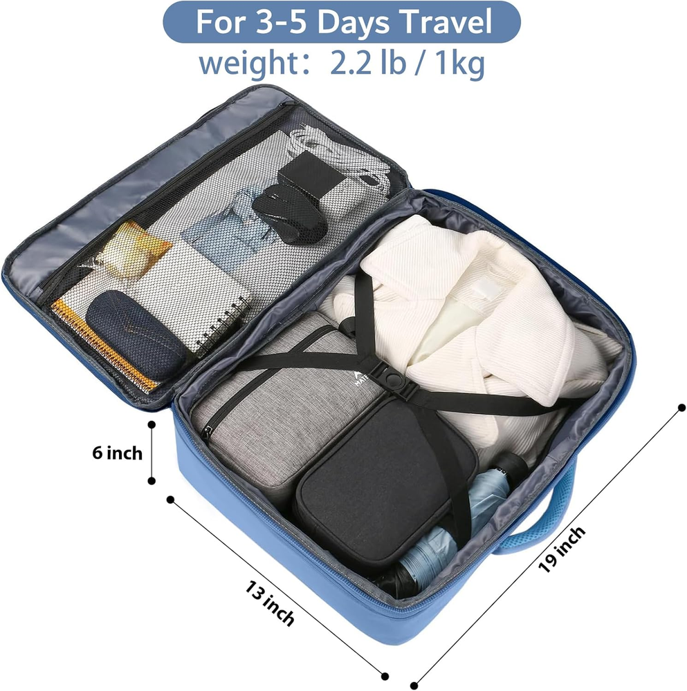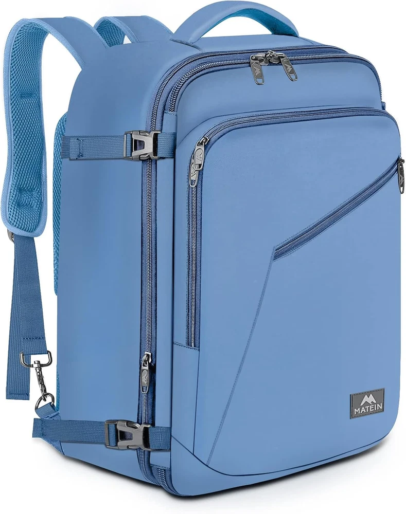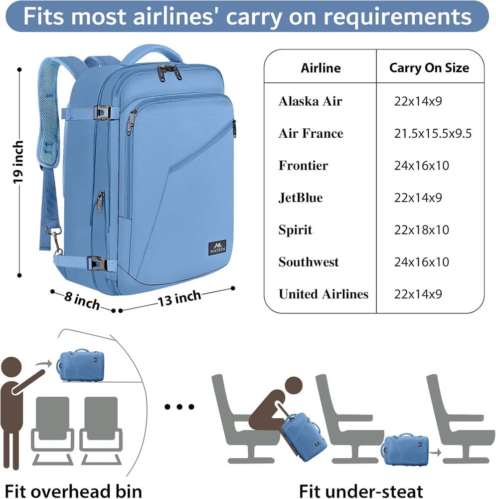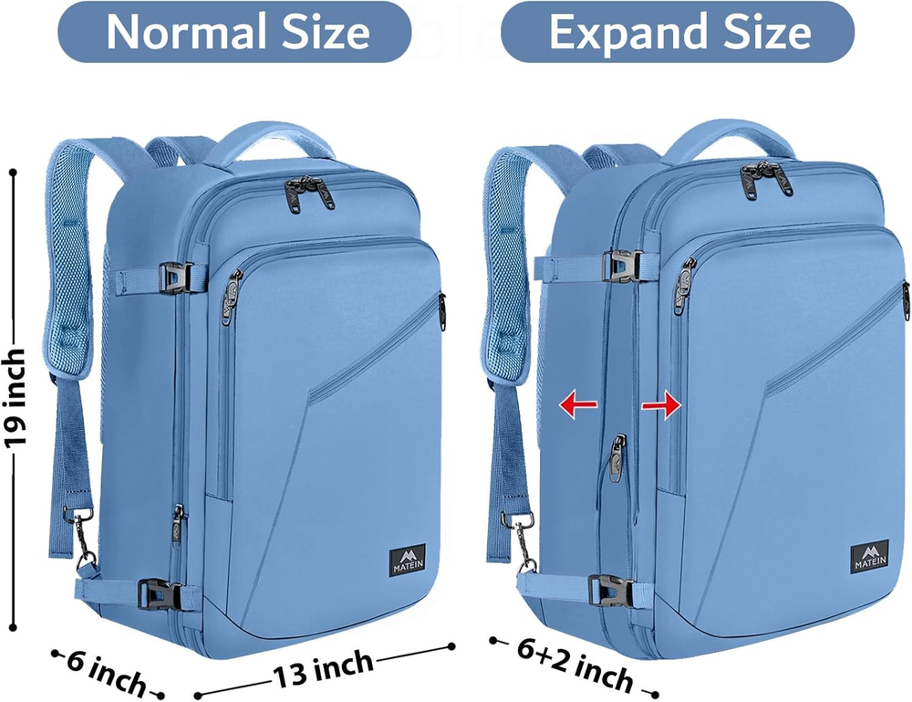Expandable & Large Capacity: This extra large travel backpack with expandable feature offers you more packing capacity. Unzipping to get 45L storage then can easily hold packing cubes, make-up bag, outfits, camera bag and gear, etc. It fits overhead and under seat while on state of standard carry on size, is suitable for men, women, weekend traveler, or occasional vacationer. This versatile luggage backpack also meets airline carry-on requirements for airlines such as Easy Jet, Spirit, Jet Blue Convertible Design: Dimensions 19*13*8inch, Lightweight 1Kg(2.2lb) The carry on backpack is designed with hideaway padded shoulder straps which can be easily stored away in zippered back panel, transforming this vacation backpack from carry-on duffle to briefcase style and provide you a more flexible carrying experience. A luggage strap on the back is designed to fit on luggage/suitcase, for easier carry on international travel or cruise Easy to Carry: The luggage backpack is light to carry due to its adjustable shoulder straps, comfortable air-mesh ventilated back panel. 2 padded grab handles are set on the top and the side of the travel backpack, making it easily to take the bag from an overhead bin. The gift choice for Thanksgiving Day, Christmas, New Year, Valentine's Day, also available as travelers gifts Built for Travel: Front compartment is for little gear such as phone, earphone. The large inside pocket has internal compression elastic straps. The padded straps include a sternum strap that can be adjusted upward or downward, set to go across your chest, relieving the weight from your shoulder. 4 external compression straps keep contents from sloshing around and can get an inch or 2 more of vertical space also reduced stress on the zippers Heavy-duty: This large travel backpack is made of water resistant lightweight polyester with lockable zipper heads. Could be survived in different temperatures. With sturdy zippers and decent stitching, this backpack won't show any defects when on the go, ensuring you an unforgettable weekend getaway. Does your partner like to travel? It's also a practical Christmas and New Years gift for your parents, traveler Product Description Carry On Travel Backpack 3 In 1 Carry On Backpack Carry-On Travel Backpack Offering you an easy trip: Luggage backpack is specifically designed with multiple carrying options like BACKPACK, SUITCASE and BRIEFCASE style. Good Gift for Travel Are you planning a nice trip with your family? Do you want to surprise your parents? You definitely want to find a backpack specially designed for a travel or for daily use. Matein travel carry on backpack will be a good choice. Idea good gifts for travelers. Also a practical gift for your family or sweetheart. Hideaway Shoulder Straps S shape straps are padded with air mesh, it could be hidden away which can be easily converted from backpack into a carry on duffel bag, offering you more carrying options! Expandable Compartment Expand 8L capacity with 4 compression straps providing you more packing capacity. It also can reduce stress on the zippers. Adjustable Chest Straps The chest straps could be adjusted lengthwise (slide up and downthe the shoulder straps). Offering you better wearing experience. Lockable Zipper Head Protect your valuable items well with your own zipper lock.(Tips: LOCK IS NOT INCLUDE IN THE BACKPACK). Carry-On Travel Backpack Its decent size makes it perfect to bring as a carry-on luggage on a airplane. No more worry about you could not take your backpack to the plane. Front Organizer Pockets Zippered access pocket is perfect for business or travel essentials, from passport to tablet. Roomy Main Compartment Large backpack is spacious enough to hold belongings and essentials for a one-week trip like your clothes, shoes, laptop and so on. Inner compression straps are generous enough in length and the positions could be adjusted , preventing your belongings from shifting. Organized Compartment Well for cell phones, Power Back,earphone, wallet, magazine or any other small items. Organized Multiple organized pockets and roomy compartment offer a large capacity up to 40L. Expandable zipper compartment enlarges more than 8L for storage. Zipper closure and compression straps keep your items organized and safety on the trip. OUTDOOR/INDOOR activities and perfect for daily use International flight travel Business trip Camping,Trekking Weekend Getaway,Vacation Overnight Trip Comfortable Wide padded shoulder straps make backpacking easier. Thanks to the sternum straps which take the weight off your shoulders, you will be free of back pain and shoulder strain. Gift Choice for Women, Mother, Father, Friends, Family Mother's Day gifts, Women's Day gift, Gifts for travelers, Valentine's Day gifts, Gift for Thanksgiving Day, gift choice for Christmas, New Year