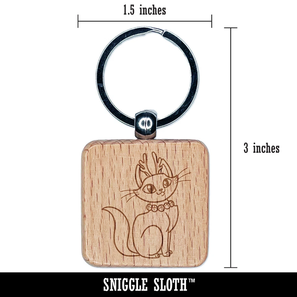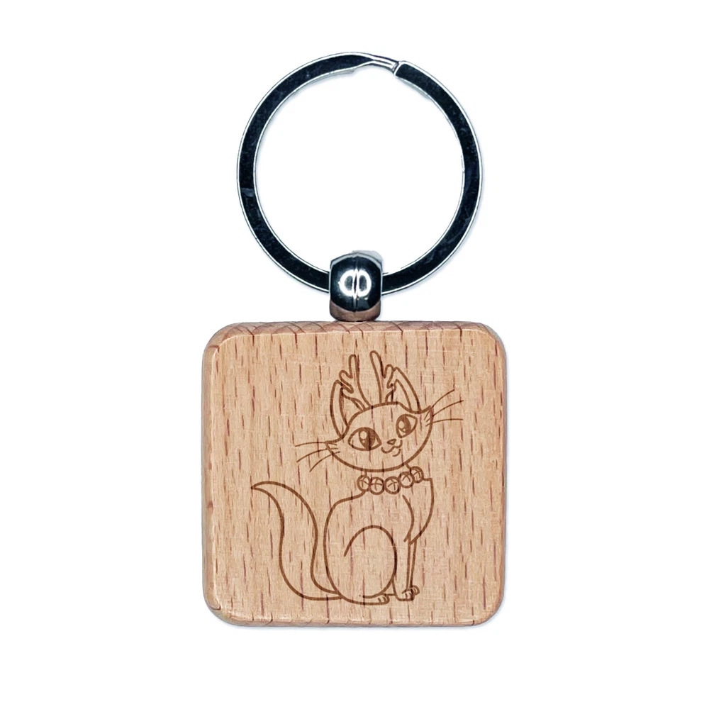 Cute Kitty Cat Reindeer Christmas Engraved Wood Square Keychain Tag Charm