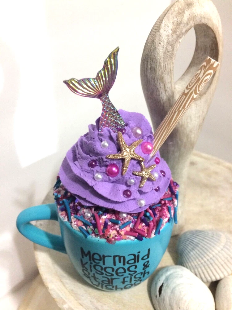 New Handmade Mermaid Kisses & Starfish Wishes Beach Themed Mini Mug with a handmade fake whipped cream . The mug has an embellishment of Glittery Starfish, Sprinkles and Mermaid Tail. Mini Mug is Ceramic and has the words Mermaid Kisses & Starfish Wishes ... Super Cute !!! Perfect of your Coffee Lover Decoration....It can sit on your tiered tray, any shelf, or on your counter by your espresso machine. Do not eat or clean the whipped cream topper; it’s for decoration only. This is not a mug topper - Its a all in one piece. This list is for 1 mug decor