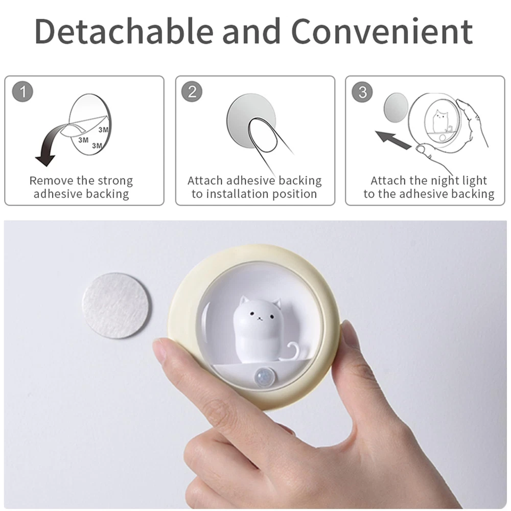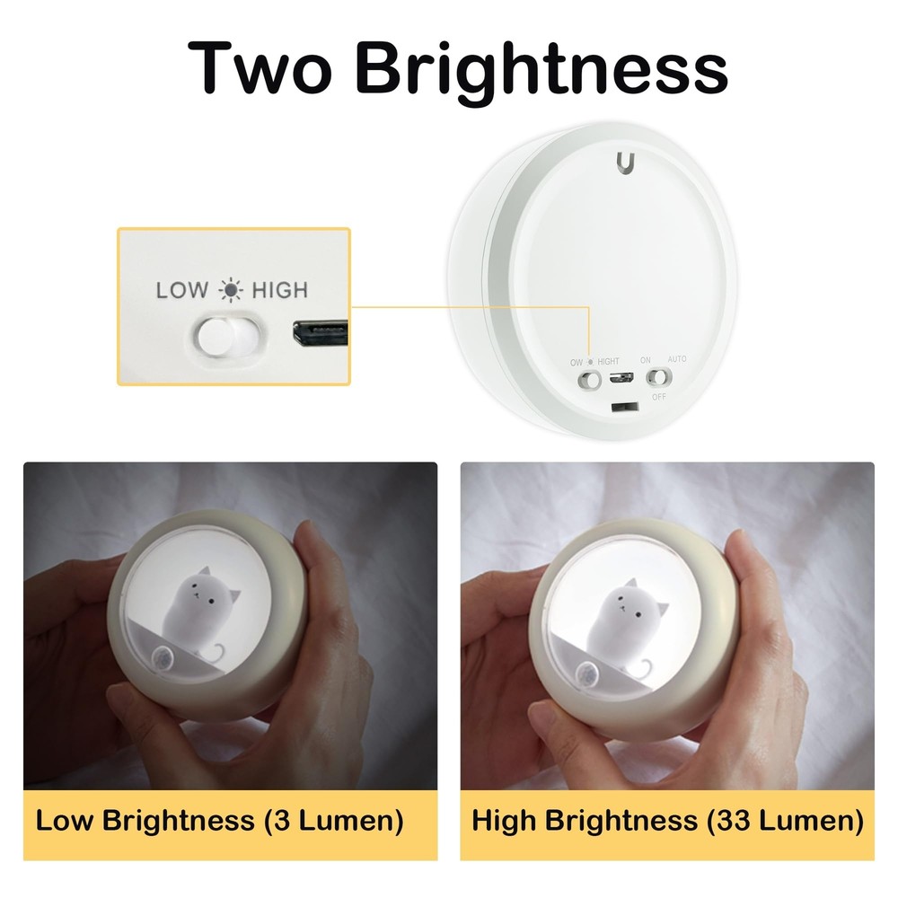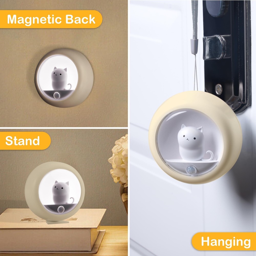 【Motion Detection】A sensor night light should have built-in sensitive motion infrared sensor capabilities to automatically turn on when it detects movement within 3 meters and within a 120° fan area. It will automatically turn off after 30 seconds (±5s) if no motion is detected.This ensures that the light only activates when someone is nearby, saving energy and enhancing security 【3 Modes & 2 Brightness】A sensor night light should offer three lighting mode: motion-activated mode/ continuous illumination mode/ Off Mode.You should have the option to set the brightness level according to their preference.HIGH brightness is natural white light, and LOW brightness is 20% 【Rechargeable Battery】This motion-activated night light charges by micro USB. Connet laptop or power bank to charge when lamp dies.A 3.5-hour charge can last up 150 hours in low brightness or 24 hours in high brightness. ( 600mAh ). Energy efficiency is crucial for a sensor night light to minimize power consumption and prolong battery life. No worries about buying and changing non-recyclable batteries frequently 【Mounting & Application】The night light has multiple mounting options .1) Magnetic Back( 3M double-sided adhesive pad and built-in magnet); 2) Hanging(inlcueded 1pc of lanyard hanging); 3) Table standing(included a stand); 4)Hold in hand. You could place it anywhere you like, such as living room, office, kitchen, hallway, attic, stairs, closet, wardrobe, etc...The rechargeable and portable design allows you to use it outdoors 【Cute Cat Design& After-Sales Service】The super cute kitten image can be used to decorate your room. And it can also be used as the best creative gift for family, friends, parents, birthdays, and Christmas. Please feel free to contact us if you have any problems about the Cat Motion Sensor. We will provide you with satisfactory after-sale service. We also provide 180 days replacement OR risk-free refund