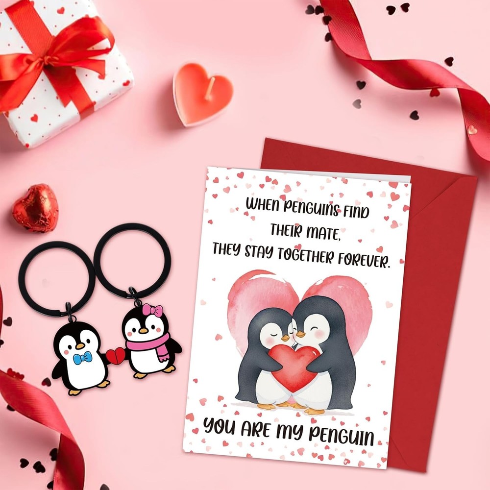 Cute Penguin Valentines Day Cards for Him Her, Anniversary Card with Keychain Valentines Day Gifts You Are My Penguin, Romantic Valentine'S Greeting Cards for Husband Wife Boyfriend Girlfriend ⭐️⭐️⭐️⭐️⭐️ Description Color Penguin Manufacturer Part Number A050985 Item Weight 1.44 ounces Size A5 or 5x7 inches Package Dimensions 7.17 x 5.2 x 0.43 inches Heart Message: Celebrate love with this penguin valentine card designed to share warm emotions and real connection. Paired with the keychain, it turns a simple gift into a sweet moment that makes your partner feel valued and truly seen Gift Ready: This card-and-keychain set arrives ready to delight your husband, wife, boyfriend, or girlfriend. As a thoughtful valentines day card, it adds charm to anniversaries or daily surprises, creating warm, memorable moments together Easy Personalization: Designed with ample blank space, this valentines day card for him or her lets you write a message that feels real and intimate. Your handwriting deepens emotional connection, turning simple words into something meaningful Charming Design: A sweet penguin theme brings playful romance to your celebration. This animal valentine's day card adds lighthearted fun while expressing affection, perfect for couples who enjoy warm, tender, and joyful shared moments Memorable Moments: Ideal for anniversaries or a funny valentines card for him, this set helps you express gratitude with joy. The keychain becomes a daily love reminder, while the card preserves a meaningful moment you both will cherish Product description