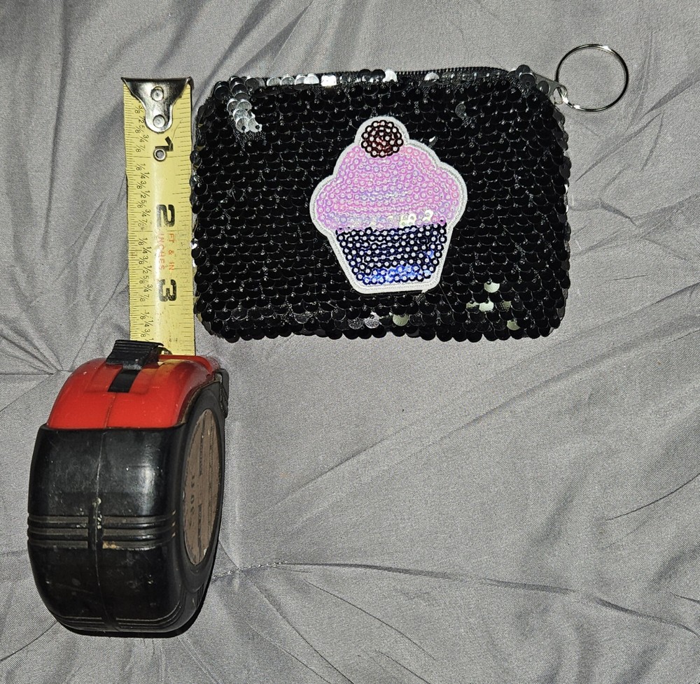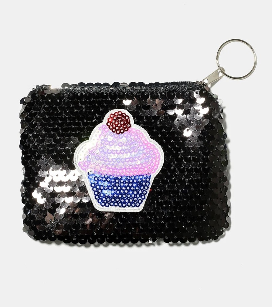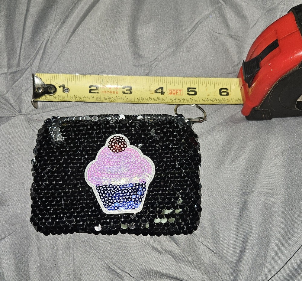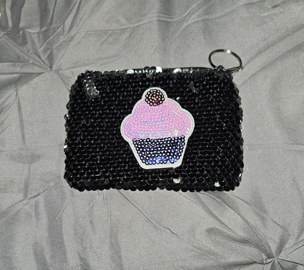 Vintage: No Brand: Unbranded Fabric Type: Sequins Personalize: No Color: Multicolor Department: Women Handmade: No Accents: Sequin, Zipper, Keychain Features: Keychain Size: One Size Pattern: Solid with Print Style: Zip with Keychain Theme: Cupcake Type: Coin Wallet Material: Sequins