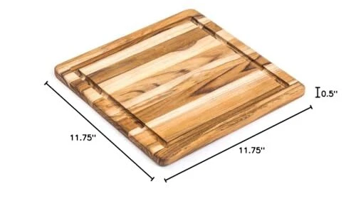 Prep and serve with the essential square cutting and carving board from . Made from edge grain teakwood, this board features a juice canal on all sides. It is ideal for both cutting and serving your favorite meat and cheeses. Serve at events like a with style. This board makes the perfect addition to any kitchen. 12" L x 12" W Cutting Board With Juice Canal Square Teak Wood Serving Board Ideal For Meal Preparation And Serving Sourced From Sustainable, Managed Plantations Dimensions: 12 x 12 x .55 in. - FSC Certified