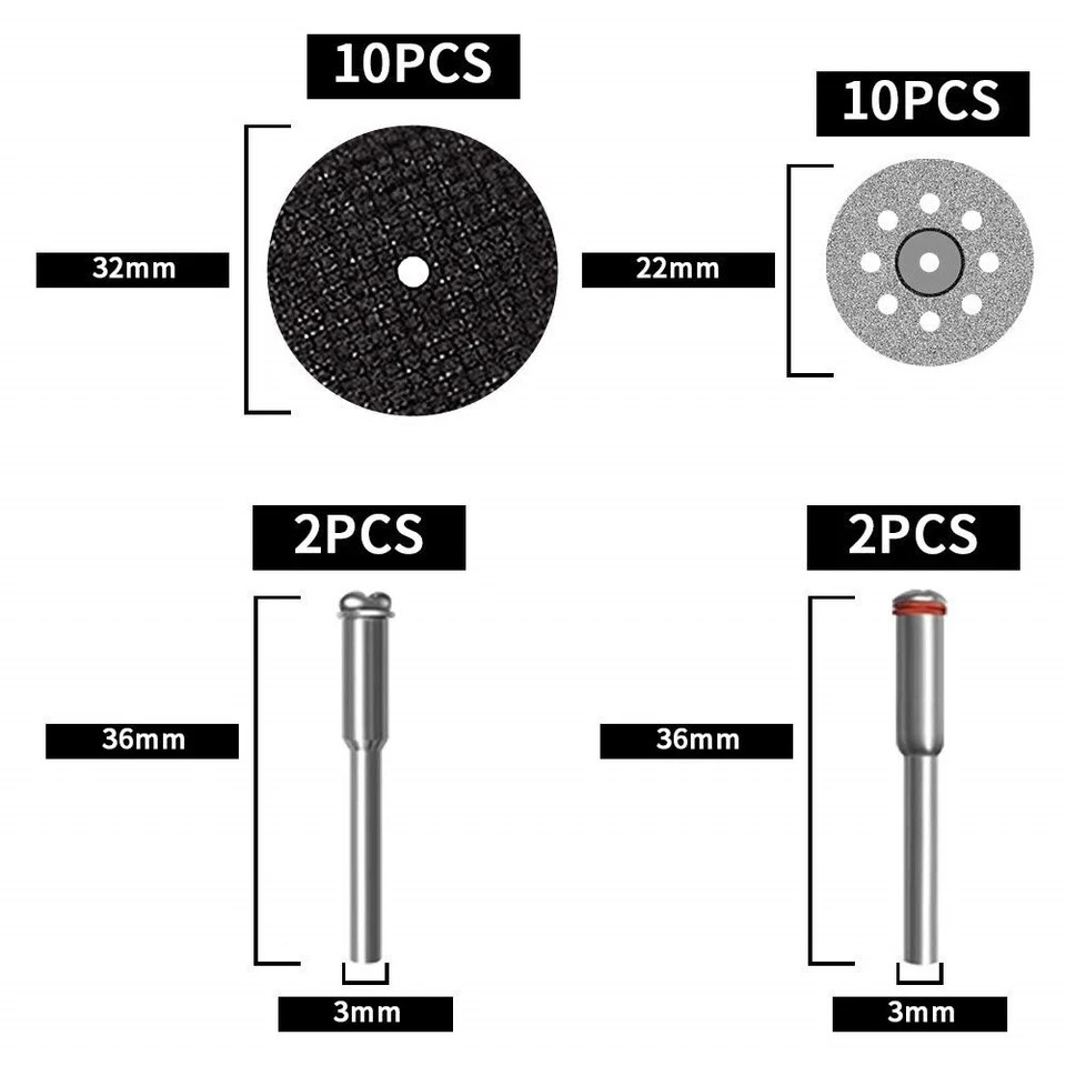 About this item ★ 10 pcs DIAMOND CUTTING WHEELS – It is completely coated with fine diamond particles -- thin and sharp . Designed for rotary tools and replacement EZ545/544 lock cut off wheel . Suitable for cutting gem, jade and glass ★ 10 pcs RESIN CUT OFF DISCS – With low heat generation and thin cutting line , the cut off wheels are applicable to electric drills , hanging grinders , electric grinders , etc . They can be used to cut metal, plastic , chassis modification , thin metal circuit board and DIY production after connected with mandrels , and are ideal for olive cutting . And comes with 2pcs 3mm mandrels ★ 6 pcs HSS CIRCULAR SAW BLADES – The cut off saw blades are high speed steel and there are 6 kinds of outer diameters 22/25/32/35/44/50mm and the thickness of 0.8 mm. They are suitable for cutting wood , plastic products , aluminum alloy , soft metal, etc . And comes with 1pcs 1/8''(3.2mm) shank + 1pcs 6mm shank ★ HIGH COMPATIBILITY – These cutting wheels are suitable for Dremel rotary tools as good as original . We use original rotary tools to test this accessory kit. And the mandrels fit for most power die grinders or rotary tools & air tools . The whole cutter wheels set is suitable for cutting wood , plastic , gemstone , glass , ceramic , stone, aluminum and copper . The mini rotary tool is suitable for DIY projects and the home hobbyist 【CLIENTS FOREMOST, SERVICE FIRST】Best product and top service are always what we are aiming to provide for each customer friends . If you are not satisfied with the size, the functions or any other reasons , just reach out to our customer services team , solutions would be within 24 hours