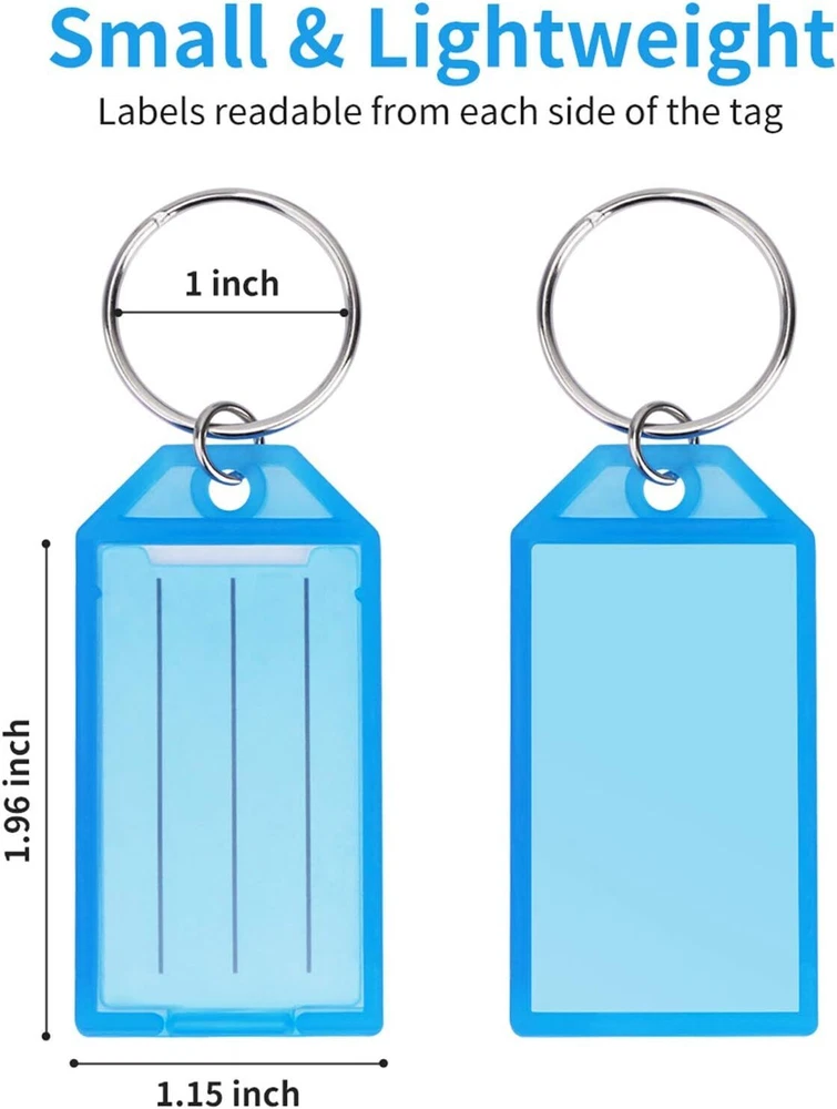 Cuttte 20 Pack Plastic Key Tags with 20PCS, White, Purple, Green, Pink, Blue Product Details Closure Type: Clip Brand: Cuttte Item dimensions L x W x H: 6.9 x 0.9 x 4 inches Number of Pieces: 20 Style: Modern Shape: Rectangular Manufacturer: Cuttte Item Weight: 5 ounces Product Dimensions: 6.9 x 0.9 x 4 inches Material Type: Plastic Size: 20PCS Manufacturer Part Number: Key Tags Color: White, Purple, Green, Pink, Blue Material: Plastic Theme: Custom Special Feature: Lightweight Included Components: 1 re-usable container User friendly. The nice little plastic re-usable container is nice for storing them in and keeping them organized All good solid materials. The tags are made of hard polypropylene which is reusable, reliable and lightweight. Total size: 1.15 x 2.2inch, large label window size to write more words Each one is come with a label you can actually write on. Labels are readable from each side of the tag. And There is plastic cover for label so ink does not fade. The cover opens and closes easily. No need to remove the key ring to take out the label Great assortment. 20 Pack key tags with 5 colors, 4 for each color. Nice bright colors, great for identifying different keys for different locks Organizing keys is a key to organizing your life. These work great for name tags on keys, pets, kids backpacks, lunchboxes, childs jackets, luggage, USB drivers, or anything else that needs an ID