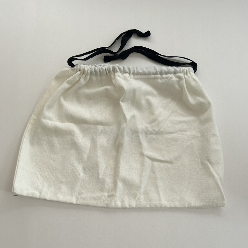 This is a Cuyana drawstring dust cover bag designed for shoes or a purse, ideal for travel or storage. The bag measures 12" wide x 8.75" and is made of a cotton blend material. It is an off-white color and size small, suitable for women looking to protect their accessories while on the go.