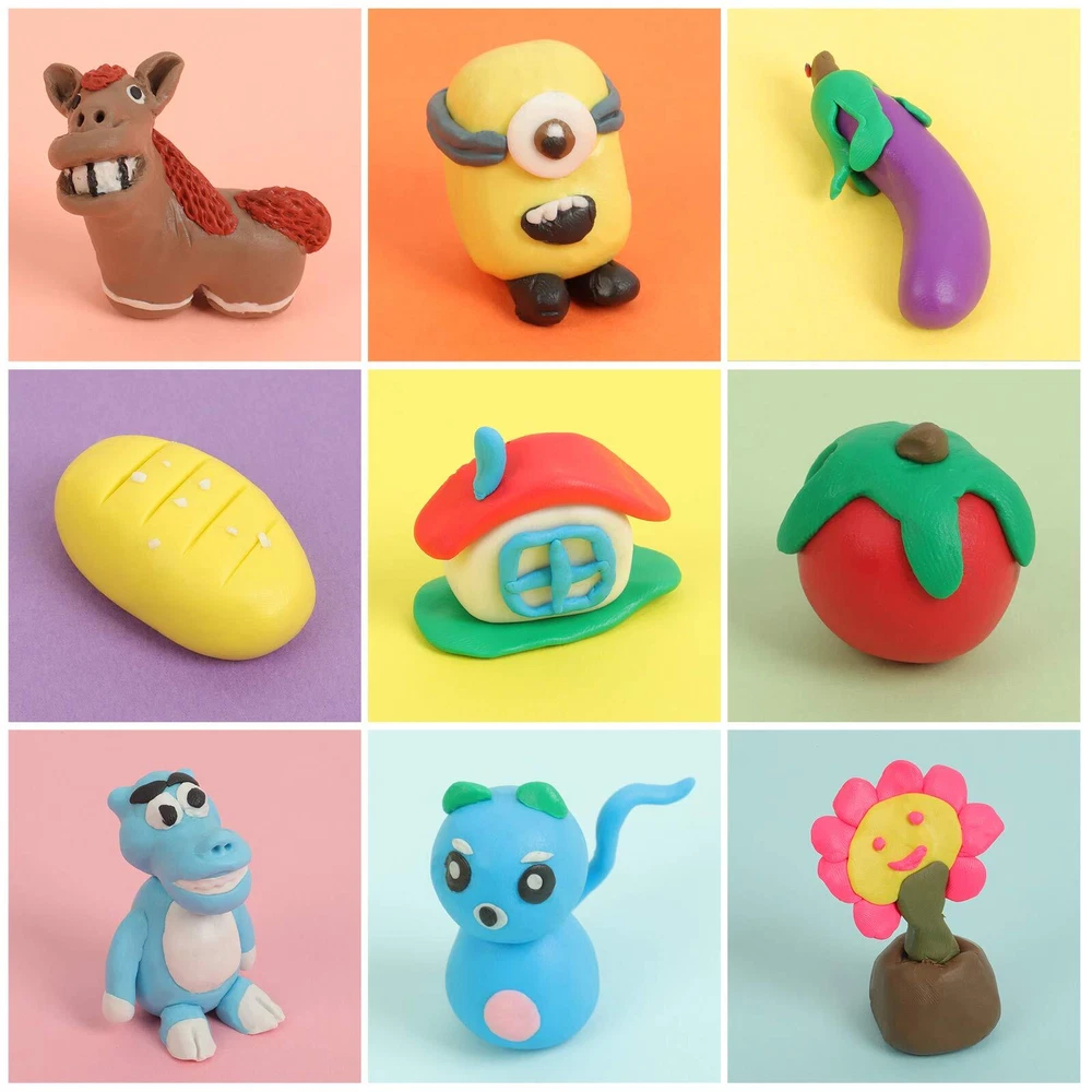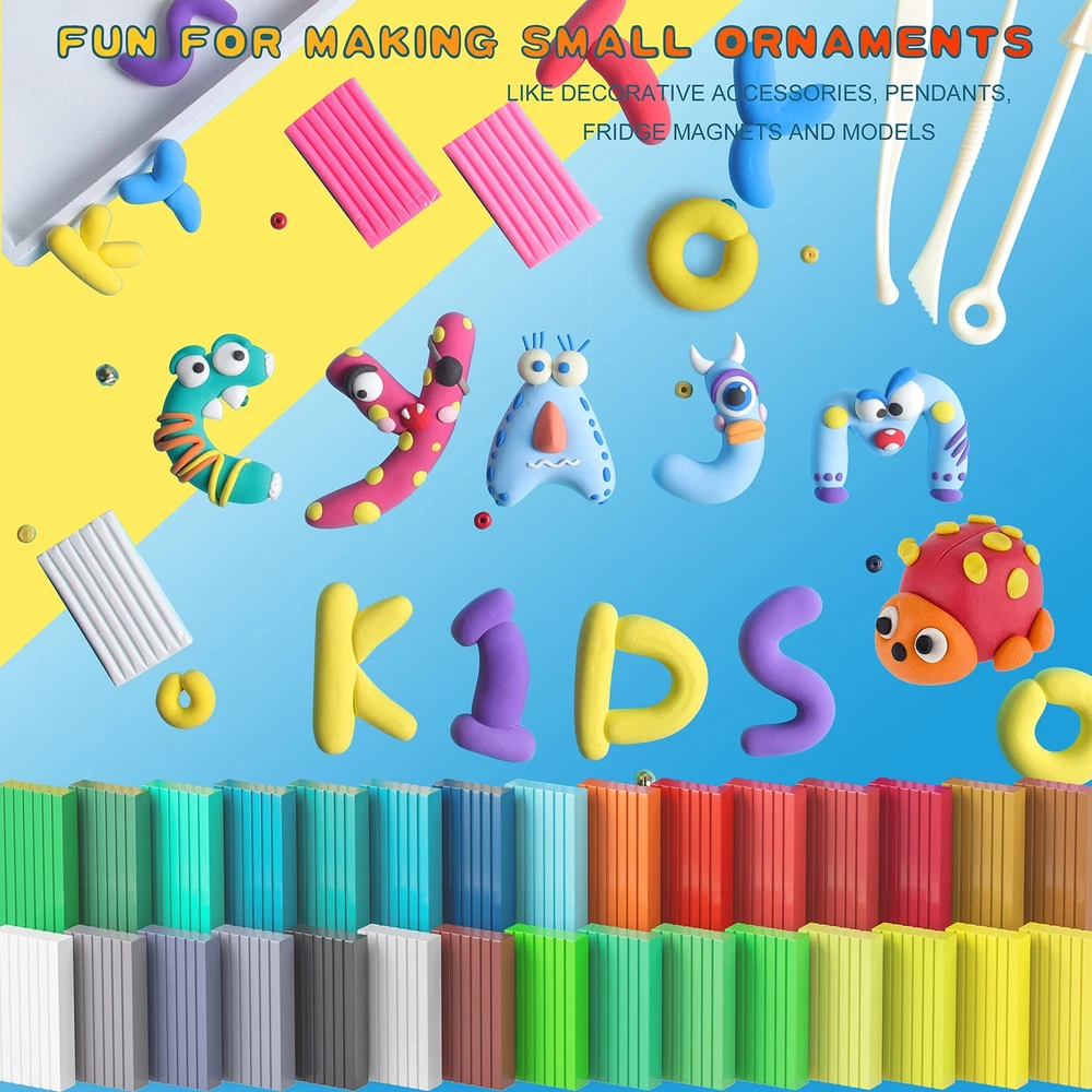 1.Good ductility, random fabrication, rich colors, satisfying matching,non-sticky, non-fading, easy modeling, non-toxic, environmentally friendly,especially suitable for artistic creation.. 2.Soft clay can help children use their brains and hands, inspire children tothink creatively, and cultivate cultural temperament. It is the favorite of theDIY people in the craft industry. Polymer Clay Kits: ▶50pieces of colored polymer carving clay ▶2-layerportable plastic storage box ▶5 Sculpting Clay Tools ▶1silicone molding mold ▶1manual ▶2bells ▶10beads ▶3pairs of earring hooks ▶1hairpin hoder ▶3ring holders ▶1key ring ▶9-needles ▶6mobile phone chain 1 Slicker SHAPINGMETHODS: 1.Ovenbaking: ▶Placepolymer clay on an oven-safe glass Tin foil or metal surface. ▶Bakeat a temperature of 248-266°F (120-130°C) for 15 -30minutes per 1⁄4 inch (6.4mm) thickness ▶Afterthe baking is completed, the work can be taken out after cooling down. 2.Heating by hair dryer or hot air gun (suitable for 1-2 inch size works): ▶Putthe work in a closed box and heat it for 3-5 minutes 3.Boiling method (suitable for 1/3 inch size works): ▶Putthe workpiece on the plate and put it in cold water until the water boils ▶Keepboiling for 10-20 minutes ▶Takeit out after cooling water Safety Guidelines: ▶CHOKING HAZARD-Small parts.soft clay is forbidden for children under 3 years old,children 3-8 years old need to be accompanied byan adult for artistic creation. ▶When using polymer clay,be careful not to wipe your eyes and washyour hands often,especiallybefore eating. ▶Polymer clay is an oily material.Please wash your hands before use and apply somehand cream to make the Sculpting clay noteasy to stick to your hands and easy to make. ▶Modeling clay will never solidifyif it is not baked,itcan be recycled for creation,and it needs to be stored in a cool place for next use. The Most Ideal Diy Gift: 50 Color Polymer Clay, With Rich Visual Sense, Creative Inspiration, Discover Children's Artistic Talent, Promote Brain Development, Stimulate Creativity, Enhance Parent-Child Communication, Halloween, Christmas Clay Set Gift Safety Material: Strictly Comply With Astm D-4236/Ce (En-71) Standards And Requirements, Polymer Clay Is Made Of Polymer, And Has Good Toughness And Does Not Stick To Hands. Accompanies Your Child Safely Product Packaging: 50 Rich Colors Of Modeling Clay For Kids, Each 0.7 Ounce Piece Of Clay Is Packed In a Pe Bag, 5 Sculpting Clay Tools, Silicone Model, Accessories And User Manuals, 2 Layers Of Plastic Storage Boxes, With Clay Sculpting Tools ,Clay Kits,Molding Clay For Kids Total Weight 2.87 Pounds Modeling Clay Mode: Oven Bake Clay-Set The Temperature To 130°C (266°F) And Bake For 10-30 Minutes-Recommended, Hair Dryer Heating (Suitable For Small Workpieces Of 1-2 Inches), Boiling Method, Don’t Microwave,Instructions For Safe Use: Children Aged 1 To 3 Are Prohibited From Using It, And Children Aged 3 To 6 Are Recommended To Use It Under The Supervision Of An Adult CyAJM Polymer Clay Set: If the product does not work, you can contact our friendly customer service