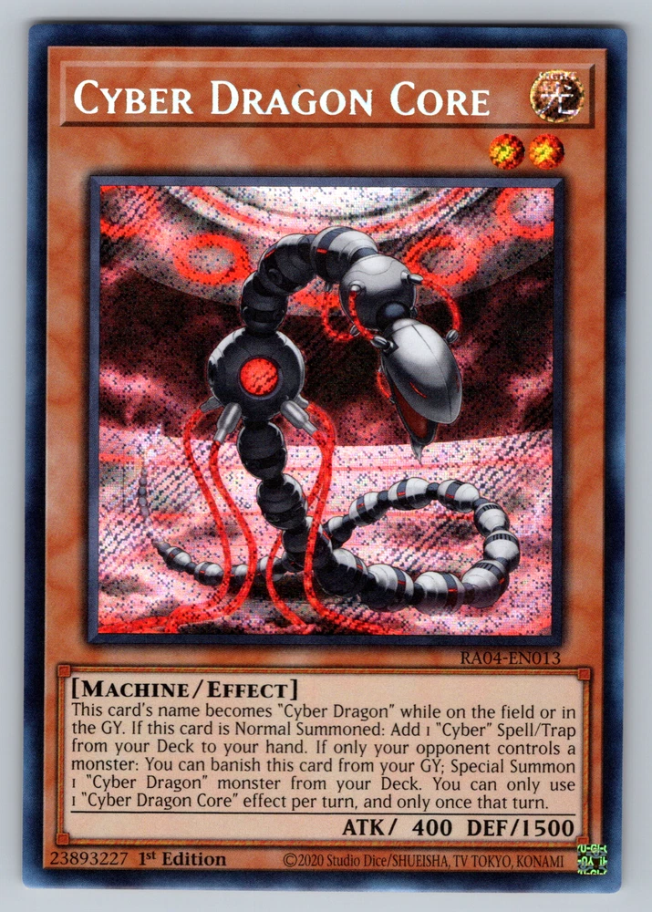 This listing is for Cyber Dragon Core - RA04-EN013 from the Quarter Century Stampede set . Each photo in this listing is a stock photo as this is a bulk variation listing. You will receive the same card in the same condition selected , but it may not be the exact copy from the photo . Therefore, centering on the card you receive may differ from the centering of the card listed in the photo. Please be aware of this before purchasing. Each card will be in Near Mint condition. Cards in this listing may have some very minor imperfections (such as few small dots of whitening or a couple of very small scratches), but there will be no major damage to the cards (such as excessive whitening, scratches, edgewear, creases, water damage, etc). The cards from your order will be securely packaged in a card saver and card saver perfect fit sleeve and shipped with the eBay Standard Envelope program for cards under $20. Whether you're looking to power up your deck or add this to your collection, you'll be sure to enjoy this card! Check out our other listings for more Yu-Gi-Oh! cards!