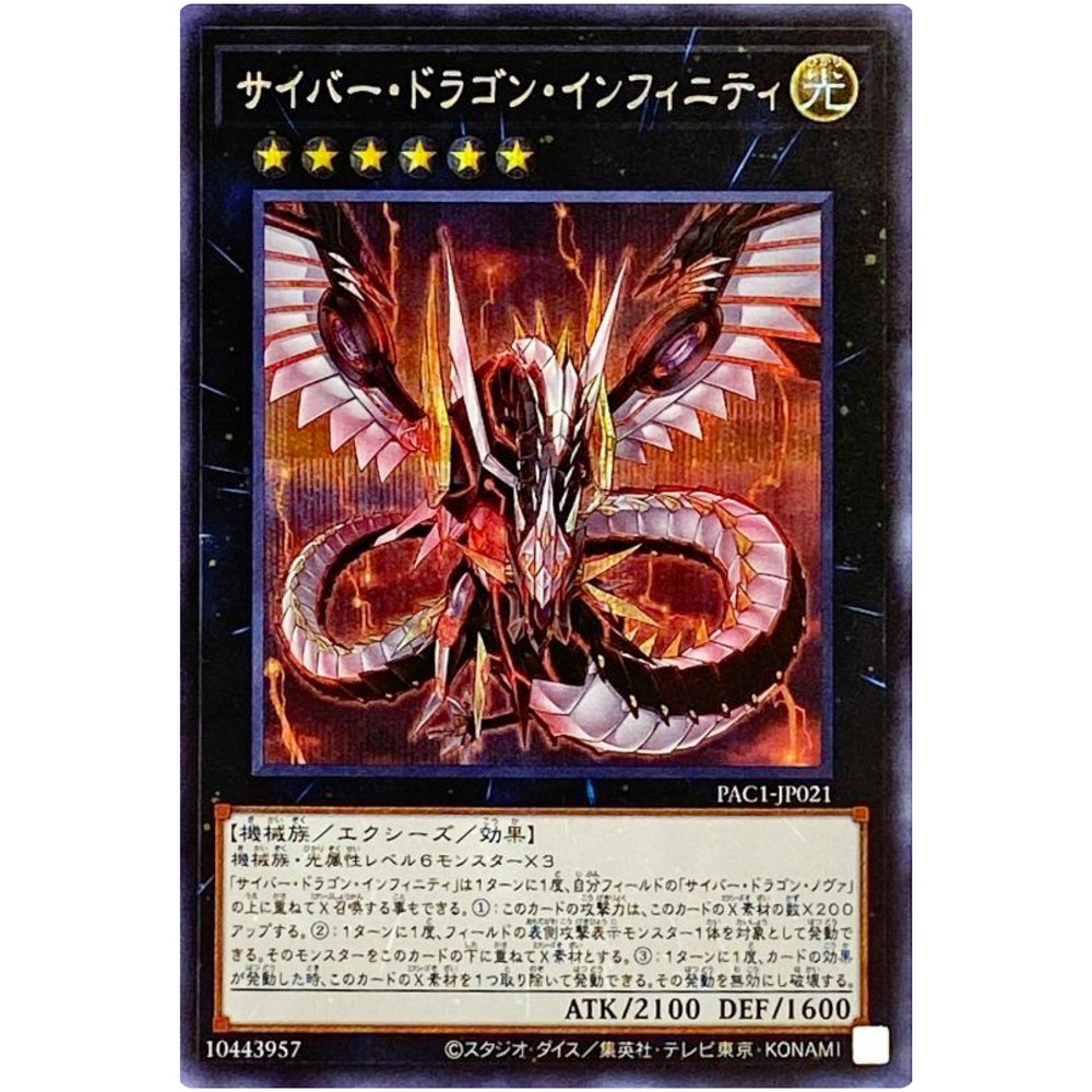 Item Discription PAC1-JP021 Cyber Dragon Infinity Front Back Card Name : Cyber Dragon Infinity Character : Cyber Dragon Infinity Rarity : Secret Rare Card Number : PAC1-JP021 Set : Prismatic Art Collection Type : Effect Xyz Monster Language : Japanese Card Condition : Near Mint Purchased cards will be clipped with cardboard, waterproofed, and shipped without any scratches or folds. Cards over $20 will be packed even tighter with a loader for each card. Shipping Policy Free shipping worldwide. Free shipping does not include tracking. There is an additional cost of US $4 for tracking. If you purchase cards totaling US $30 or more, you will receive a free tracking number. All of the products will be shipped from Japan. Economy Shipping Air mail ( no tracking ) Free Shipping Delivery time : About 2-4 weeks Standard Shipping Air mail ( with tracking ) US $4 Delivery time : About 2-4 weeks Expedited Shipping FedEx or EMS or DHL ( with tracking ) US $24 Delivery time : About 1-2 weeks Payment Policy We accept all major credit cards and Paypal payments. Return Policy We hope you will love your purchase, houever if you need to return it, we have a 30 day return policy. International Buyers Import duties, taxes, and charges are not included in the item price or shipping cost. These charges are the buyerʼs responsibility. Please check with your countryʼs customs office to determine what these additional costs will be prior to bidding or buying. If the cancellation is due to the buyer, wewill charge a fee. If there is a remote charge for your address, we will charge you for additional shipping. We are honored to receive the eBay Japan Awards 2022! I am thrilled to share that my store has won the eBay Japan Awards 2022 ! This amazing accomplishment wouldnʼt have been possible without our wonderful customers. A heartfelt thank you for your ongoing support. We will continue to improve our services, offering a diverse selection of items and top-notch customer care Thank you for helping us achieve this prestigous recognition, and we look forward to serving you in the future! Copyright ©️ 2023 Animart Japan