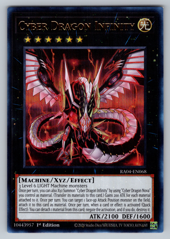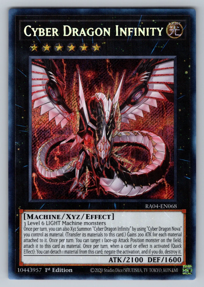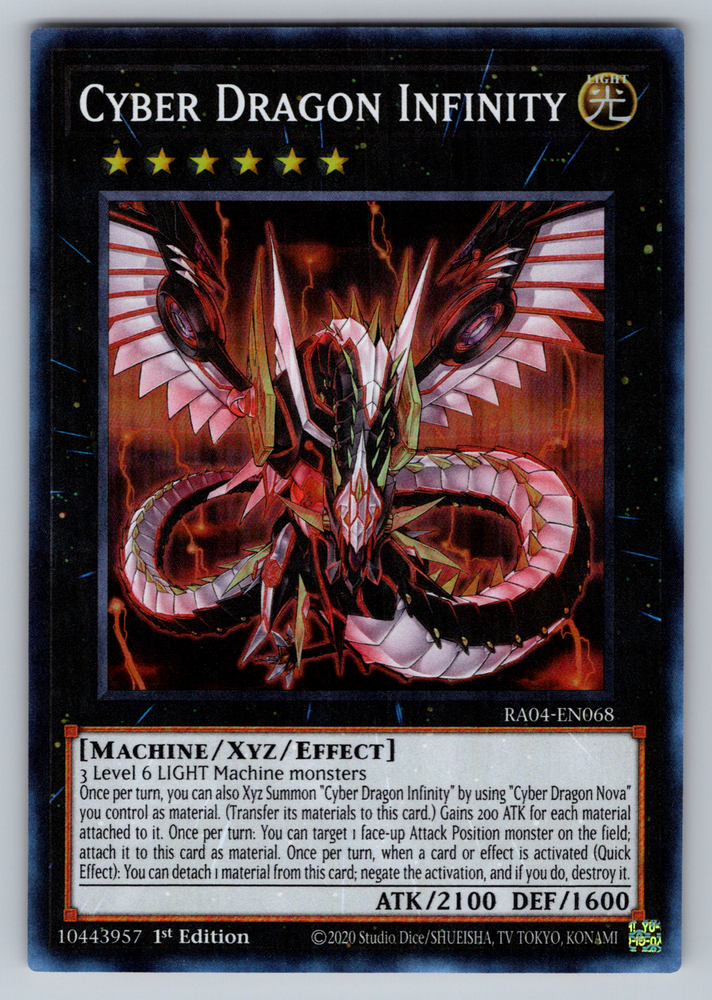 This listing is for Cyber Dragon Infinity - RA04-EN068 from the Quarter Century Stampede set . Each photo in this listing is a stock photo as this is a bulk variation listing. You will receive the same card in the same condition selected , but it may not be the exact copy from the photo . Therefore, centering on the card you receive may differ from the centering of the card listed in the photo. Please be aware of this before purchasing. Each card will be in Near Mint condition. Cards in this listing may have some very minor imperfections (such as few small dots of whitening or a couple of very small scratches), but there will be no major damage to the cards (such as excessive whitening, scratches, edgewear, creases, water damage, etc). The cards from your order will be securely packaged in a card saver and card saver perfect fit sleeve and shipped with the eBay Standard Envelope program for cards under $20. Whether you're looking to power up your deck or add this to your collection, you'll be sure to enjoy this card! Check out our other listings for more Yu-Gi-Oh! cards!