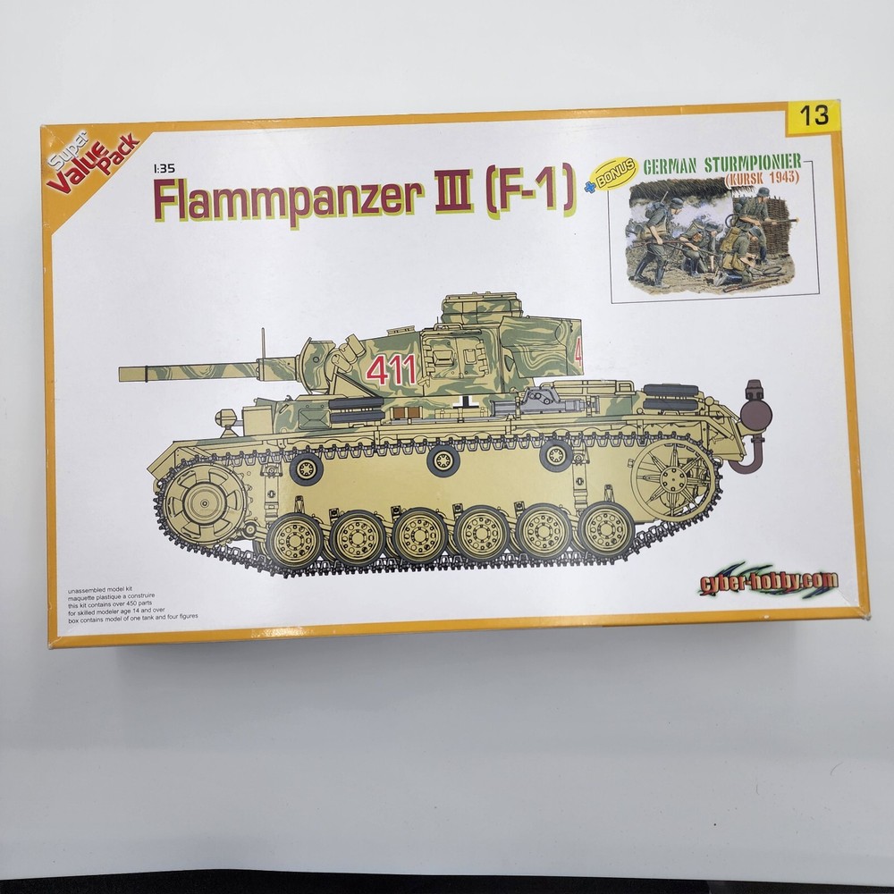 Brand: Cyber Hobby Model: Flammpanzer III (F1) Scale: 1/35 See photos for further details. Buy with confidence! *Parts pictured are shipped without the kit box, if kit box is pictured it's only to show which kit the part comes from!* *Yes, we combine shipping! Just add the items to your cart and send a request for an invoice!* All orders shipped within 2 business days Please check out my other listings for lots of other model kits! Cars, tanks, airplanes, boats, and more! Visit my store!