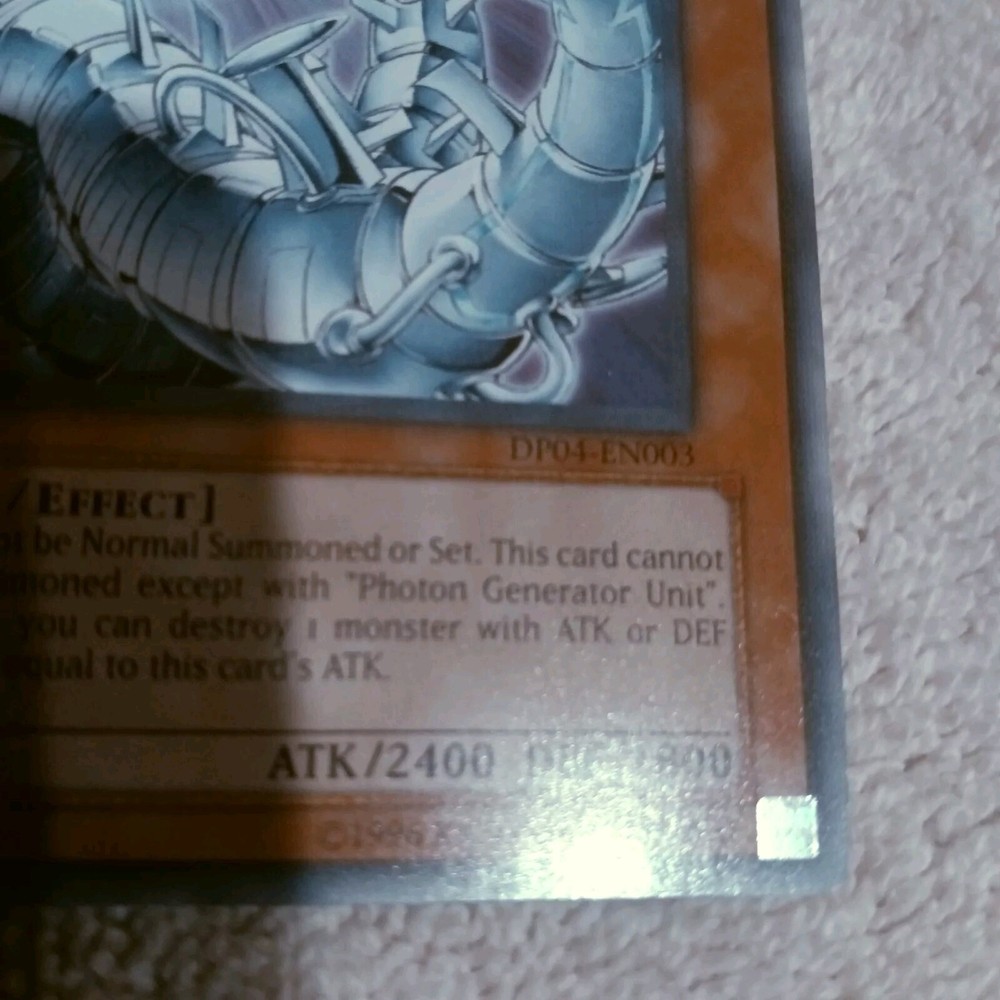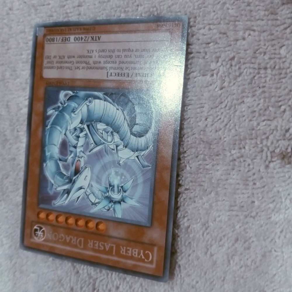 Card Name:Cyber Laser DragonManufacturer:KonamiDefense/Toughness:1800Language:EnglishSet:- Zane Truesdale -Rarity:RareCard Type:EffectCard Text:This card cannot be Normal Summoned or Set. This card cannot be Special Summoned except with "Photon Generator Unit". Once per turn, you can destroy 1 monster with ATK or DEF greater than or equal to this card's ATK.Game:Yu-Gi-Oh! TCGFeatures:Unlimited|Unlimited EditionAttack/Power:2400Creature/Monster Type:Machinebrand:KonamiCard Number:DP04-EN003Level:7Additional Description:Cyber Laser DragonAttribute/MTG:Color:Light