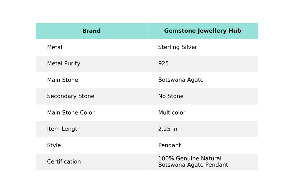 Welcome to Gemstone Treasure Hub Botswana Agate Gemstone Pendant 925 Sterling Silver Indian Jewelry For Girls Handmade Pendant, Sterling Silver Pendant, Botswana Agate Pendant, Handcrafted Pendant SKU : MP-128 Gemstone : Botswana Agate Stone Shape : As Seen In Picture Metal Purity : 925 Sterling Silver Length : 2.25 Inches Width : Inches ___________________________________________________________________ Shipping Handling - Charge - Free ( Condition apply ) Handling Time - One business day . Delivery Time - 3 to 23 Days ( Various on destination ) Postage service - (A.) India Post - Below $100 order which takes 11 to 23 days . (B.) USPS, Fedex, DHL , Aramax- Order above $100 which takes 3 to 7 days . _________________________________________________________________ Returns - 1. We provide a 100% Money Back Guarantee, excluding shipping costs, within 30 days from the date of item receipt. 2. The item must not be altered or damaged in any way shape or form. 3. Upon receiving these items your payment will be refunded. 4. Kindly reach out to us via email to obtain return instructions prior to initiating the return of merchandise. 5. Please allow up to 1 business day for all returns to receivecredit. 6. Sizing does not affect the return policy. _________________________________________________________________ Payment - We accept PayPal for Payment , should made within three days once buying or winning done , in case of late information expected . _________________________________________________________________ FAQ's - Q.(A) ARE THE ITEMS YOU ARE SELLING BRAND NEW? We exclusively offer brand-new products, refraining from the sale of pre-owned jewelry. Our entire jewelry collection is composed of 100% natural, conflict-free pieces. We do not engage in the trade of imitation or lab-grown gemstones and diamonds. Q.(B) WHAT ARE YOUR BUSINESS HOURS? Our business hours are Monday to Friday, 10:00AM to 6:00PM, excluding holidays. ________________________________________________________________ Gemstone Treasure Hub is dedicated to providing customers with exceptional handmade jewelry crafted to the highest standards of quality. We operate as both connoisseurs and manufacturers of artisanal jewelry, possessing a profound expertise in the art of elevating gemstones to perfectly align with any aesthetic preference. We are pleased to offer you the opportunity to create your own jewelry collection, adorned with authentic and exquisite natural gemstones. Our team of highly skilled artisans painstakingly crafts each individual jewelry piece, ensuring the creation of products with a unique identity that feature genuine gemstones. The jewelry articles presented on our website accurately depict the precise pieces that you will receive.