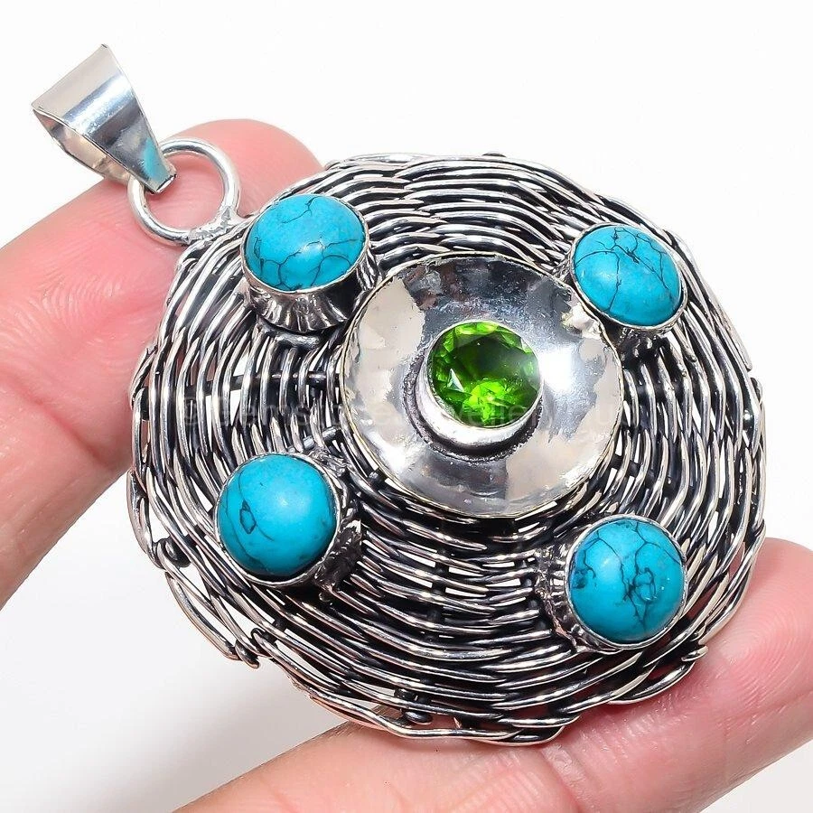 Era: Undated Necklace Length: Not Applicable Style: Pendant Signed: Yes Base Metal: Silver Cut Grade: Excellent Main Stone Color: Multicolor Type: Pendant Main Stone Shape: As Seen In Picture Brand: Unbranded Theme: Beauty, Bohemian, Ethnic, Healing, Love, Luck, Special Occasion, Halo, Love & Hearts Main Stone: Peridot Main Stone Treatment: Not Enhanced Material: Crystal, Gemstone, Stone, Metal Setting Style: Channel-Set Color: Silver Chain Type: Not Applicable Country/Region of Manufacture: India Pendant/Locket Type: Charm Pendant Shape: As Seen In Picture Closure: Not Applicable Wholesale: Yes Occasion: Anniversary, Birthday, Engagement, Wedding Secondary Stone: Turquoise Gemstone Clarity Grade: Eye Clean Metal: Silver Number of Gemstones: As Seen in Picture Features: Engraved, Nickel-Free, Handcrafted Seller Warranty: Yes Customized: No Vintage: No Metal Purity: 925 Antique: No