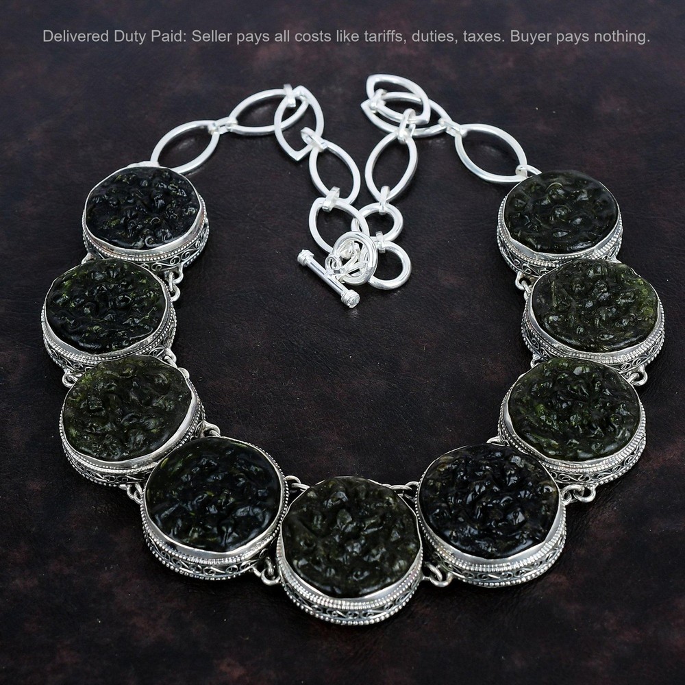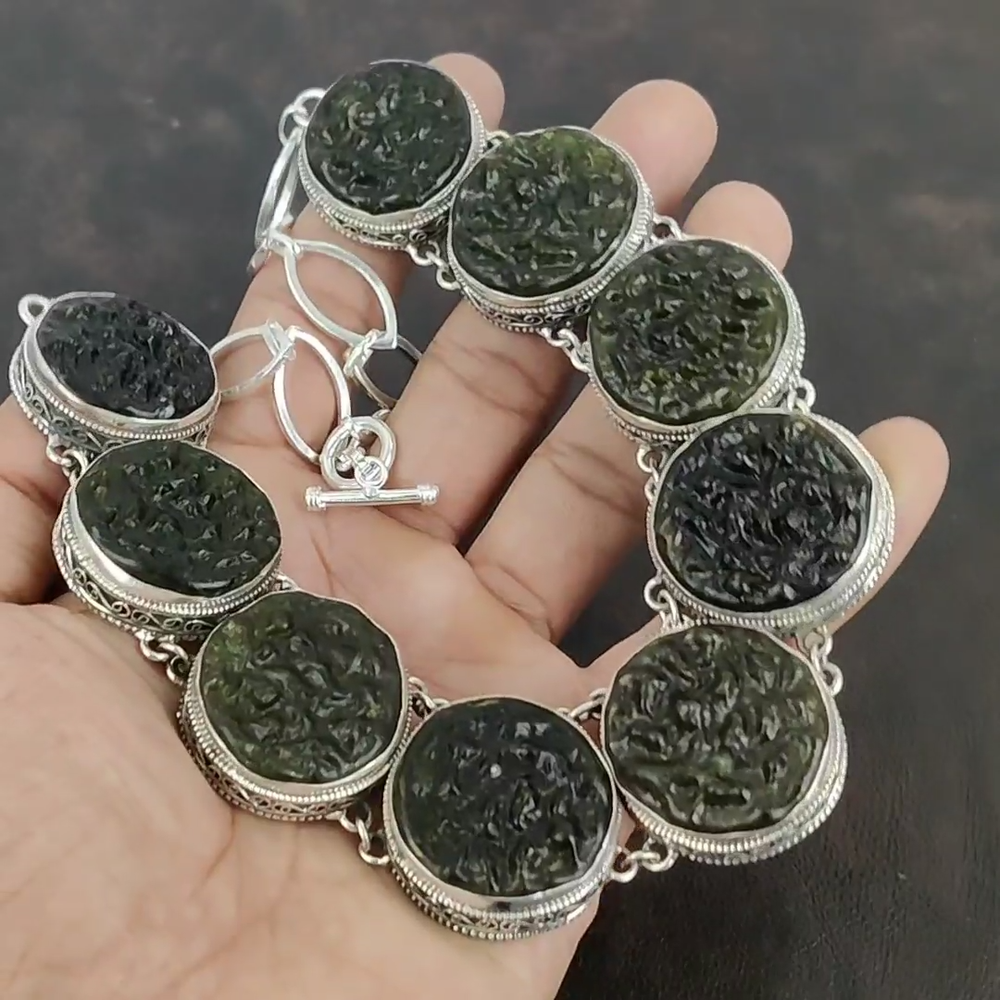 Note : Due to the natural formation of this gemstone. Slight variation in design and color are to be expected. Welcome to Kalka Jewels Cyber Monday Sale 925 Silver Natural Moldavite Sister Vintage New Chain Necklace Handmade Necklace, Sterling Silver Necklace, Moldavite Necklace, Handcrafted Necklace SKU : KN-1354 Gemstone : Moldavite Stone Shape : Round Metal Purity : 925 Sterling Silver Necklace Length : 18 Inches Adjustable : Yes Silver Jewelry is a popular choice for many people due to its unique properties and numerous benefits. Here are some of the key properties and benefits of wearing silver jewelry: Properties: Durability: Silver is a durable metal that can withstand regular wear and tear. Malleability: Silver is highly malleable, which means it can be easily shaped and molded into various designs. Conductivity: Silver is an excellent conductor of heat and electricity. Anti-bacterial: Silver has natural anti-bacterial properties, which can help prevent the growth of harmful bacteria. Benefits: Aesthetic appeal: Silver jewelry is known for its beauty and versatility, and can be worn with a variety of outfits and styles. Hypoallergenic: Silver is generally hypoallergenic, which means it is unlikely to cause an allergic reaction in most people. Healing properties: Some people believe that wearing silver jewelry can help with various physical and emotional conditions, such as arthritis, anxiety, and depression. Spiritual significance: Silver has been used in various cultures for its spiritual and symbolic significance, and wearing silver jewelry can help to connect with these traditions. Investment value: Silver is a precious metal that retains its value over time, and investing in silver jewelry can be a smart financial decision. Overall, silver jewelry offers a unique combination of beauty, durability, and benefits, making it a popular choice for people around the world. For Mother's Day Gift For Father's Day Gift For Promise For Valentine' Day For Halloween Party For Christmas Day Gift For New Year Party For Mom For Her If you can't find the information you need or need some advice for your design? Feel free to contact us. We are fast to reply :) All our work is made by hand with Love and Care in our workshop Thank you so much for visiting and hope you enjoy shopping with us Kalka Jewels is dedicated to providing customers with high-quality sterling silver jewelry. As a manufacturer of handmade jewelry, we offer an extensive range of silver gemstone jewelry that demonstrates our exceptional craftsmanship. We are skilled in adorning gemstones to complement any style, and we give you the freedom to design your own jewelry collection with dazzling, natural, and genuine gemstones. Our talented craftsmen carefully handcraft each jewelry piece, ensuring that it is unique and made with authentic gemstones.