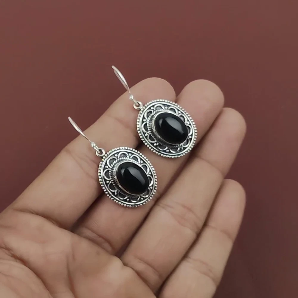Note : Due to the natural formation of this gemstone. Slight variation in design and color are to be expected. Welcome to Riyajewels Natural Black Onyx Gemstone 925 Sterling Silver Drop/Dangle Earrings For Girls Handmade Earrings, Sterling Silver Earrings, Black Onyx Earrings, Handcrafted Earrings SKU : PE-1689 Gemstone : Black Onyx Stone Shape : Oval Metal Purity : 925 Sterling Silver Length : 43 Millimetres Width : 20 Millimetres Silver Jewelry is a popular choice for many people due to its unique properties and numerous benefits. Here are some of the key properties and benefits of wearing silver jewelry: Properties: Durability: Silver is a durable metal that can withstand regular wear and tear. Malleability: Silver is highly malleable, which means it can be easily shaped and molded into various designs. Conductivity: Silver is an excellent conductor of heat and electricity. Anti-bacterial: Silver has natural anti-bacterial properties, which can help prevent the growth of harmful bacteria. Benefits: Aesthetic appeal: Silver jewelry is known for its beauty and versatility, and can be worn with a variety of outfits and styles. Hypoallergenic: Silver is generally hypoallergenic, which means it is unlikely to cause an allergic reaction in most people. Healing properties: Some people believe that wearing silver jewelry can help with various physical and emotional conditions, such as arthritis, anxiety, and depression. Spiritual significance: Silver has been used in various cultures for its spiritual and symbolic significance, and wearing silver jewelry can help to connect with these traditions. Investment value: Silver is a precious metal that retains its value over time, and investing in silver jewelry can be a smart financial decision. Overall, silver jewelry offers a unique combination of beauty, durability, and benefits, making it a popular choice for people around the world. For Mother's Day Gift For Father's Day Gift For Promise For Valentine' Day For Halloween Party For Christmas Day Gift For New Year Party For Mom For Her If you can't find the information you need or need some advice for your design? Feel free to contact us. We are fast to reply :) All our work is made by hand with Love and Care in our workshop Thank you so much for visiting and hope you enjoy shopping with us Riyajewels is dedicated to providing customers with high-quality sterling silver jewelry. As a manufacturer of handmade jewelry, we offer an extensive range of silver gemstone jewelry that demonstrates our exceptional craftsmanship. We are skilled in adorning gemstones to complement any style, and we give you the freedom to design your own jewelry collection with dazzling, natural, and genuine gemstones. Our talented craftsmen carefully handcraft each jewelry piece, ensuring that it is unique and made with authentic gemstones.