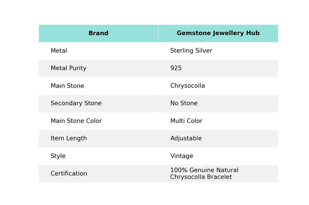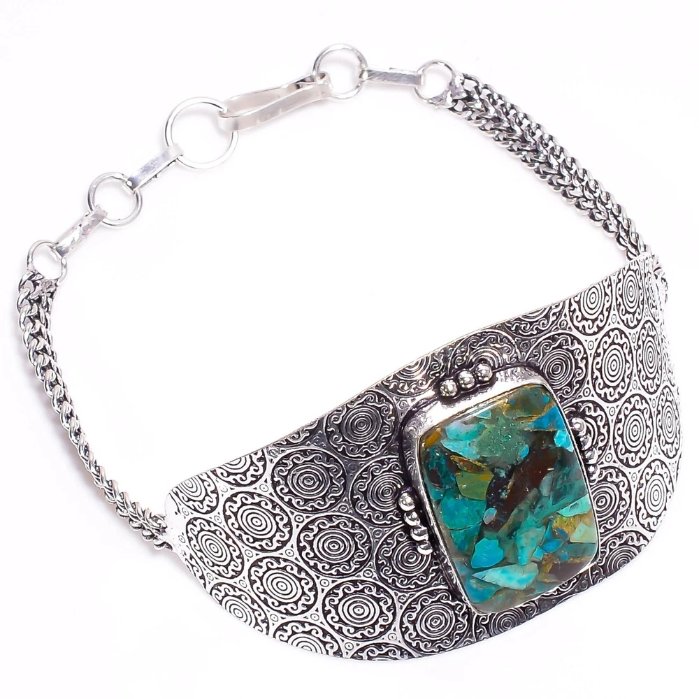 Welcome to Gemstone Treasure Hub Chrysocolla Gemstone Vintage Multi Color Adjustable Cuff 925 Sterling Silver Handmade Cuff, Sterling Silver Cuff, Chrysocolla Cuff, Handcrafted Cuff SKU : AAC-32 Gemstone : Chrysocolla Stone Shape : As Seen In Picture Metal Purity : 925 Sterling Silver Cuff Length : Adjustable _________________________________________________________________ Shipping Handling - Charge - Free ( Condition apply ) Handling Time - One business day . Delivery Time - 3 to 23 Days ( Various on destination ) Postage service - (A.) India Post - Below $100 order which takes 11 to 23 days . (B.) USPS, Fedex, DHL , Aramax- Order above $100 which takes 3 to 7 days . _________________________________________________________________ Returns - 1. We provide a 100% Money Back Guarantee, excluding shipping costs, within 30 days from the date of item receipt. 2. The item must not be altered or damaged in any way shape or form. 3. Upon receiving these items your payment will be refunded. 4. Kindly reach out to us via email to obtain return instructions prior to initiating the return of merchandise. 5. Please allow up to 1 business day for all returns to receivecredit. 6. Sizing does not affect the return policy. _________________________________________________________________ Payment - We accept PayPal for Payment , should made within three days once buying or winning done , in case of late information expected . _________________________________________________________________ FAQ's - Q.(A) ARE THE ITEMS YOU ARE SELLING BRAND NEW? We exclusively offer brand-new products, refraining from the sale of pre-owned jewelry. Our entire jewelry collection is composed of 100% natural, conflict-free pieces. We do not engage in the trade of imitation or lab-grown gemstones and diamonds. Q.(B) WHAT ARE YOUR BUSINESS HOURS? Our business hours are Monday to Friday, 10:00AM to 6:00PM, excluding holidays. ________________________________________________________________ Gemstone Treasure Hub is dedicated to providing customers with exceptional handmade jewelry crafted to the highest standards of quality. We operate as both connoisseurs and manufacturers of artisanal jewelry, possessing a profound expertise in the art of elevating gemstones to perfectly align with any aesthetic preference. We are pleased to offer you the opportunity to create your own jewelry collection, adorned with authentic and exquisite natural gemstones. Our team of highly skilled artisans painstakingly crafts each individual jewelry piece, ensuring the creation of products with a unique identity that feature genuine gemstones. The jewelry articles presented on our website accurately depict the precise pieces that you will receive.