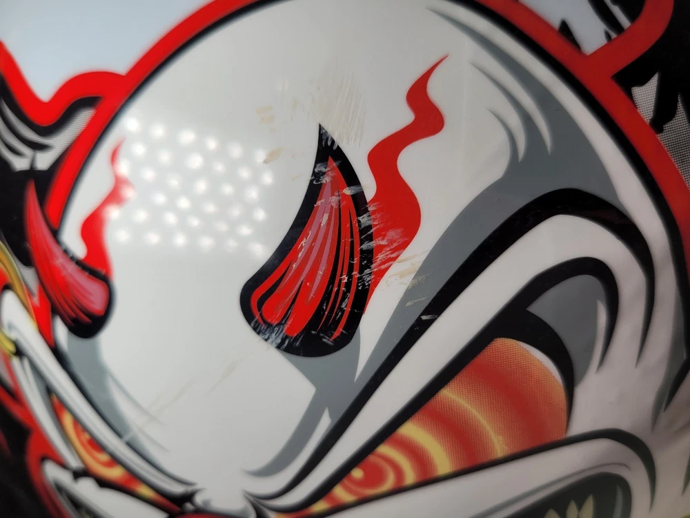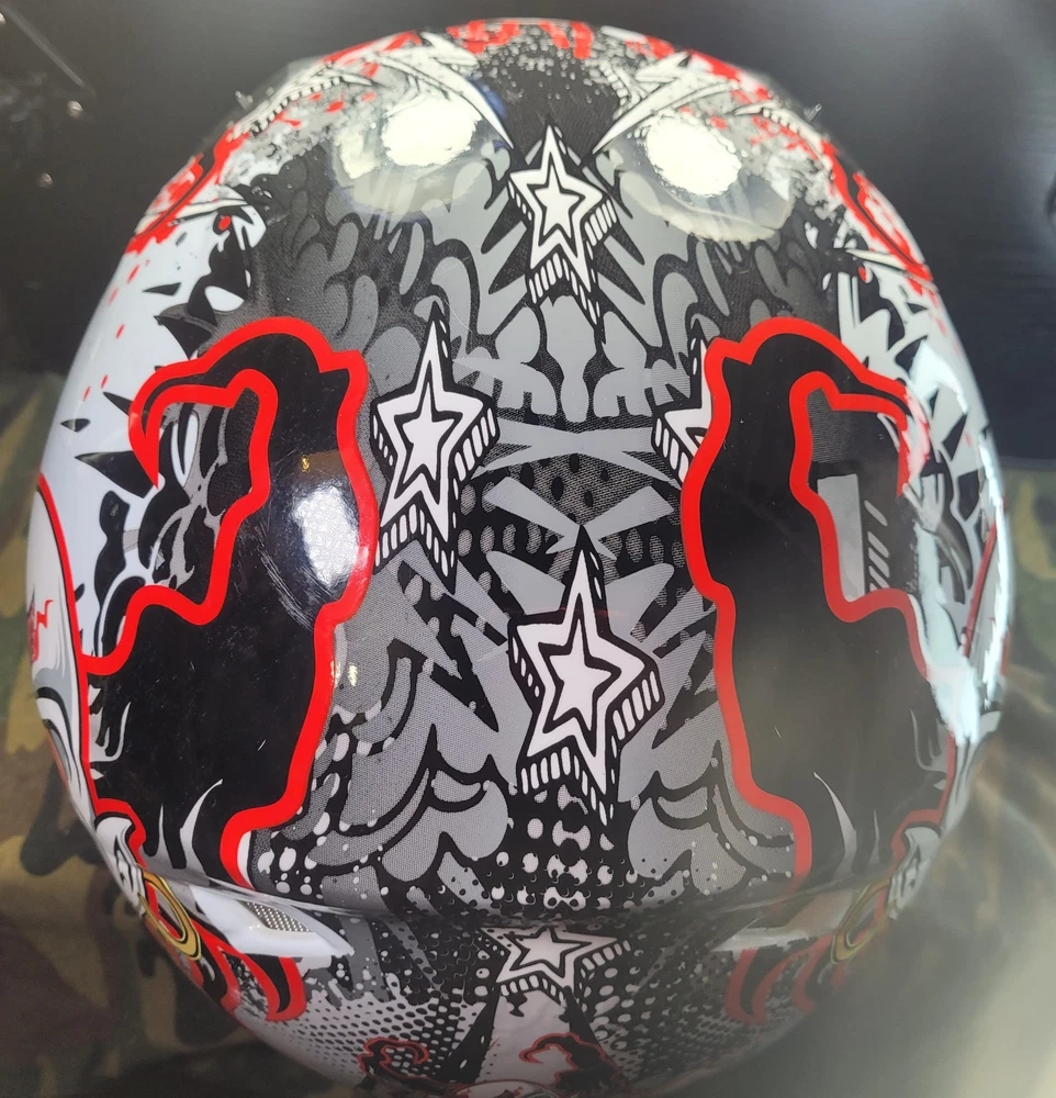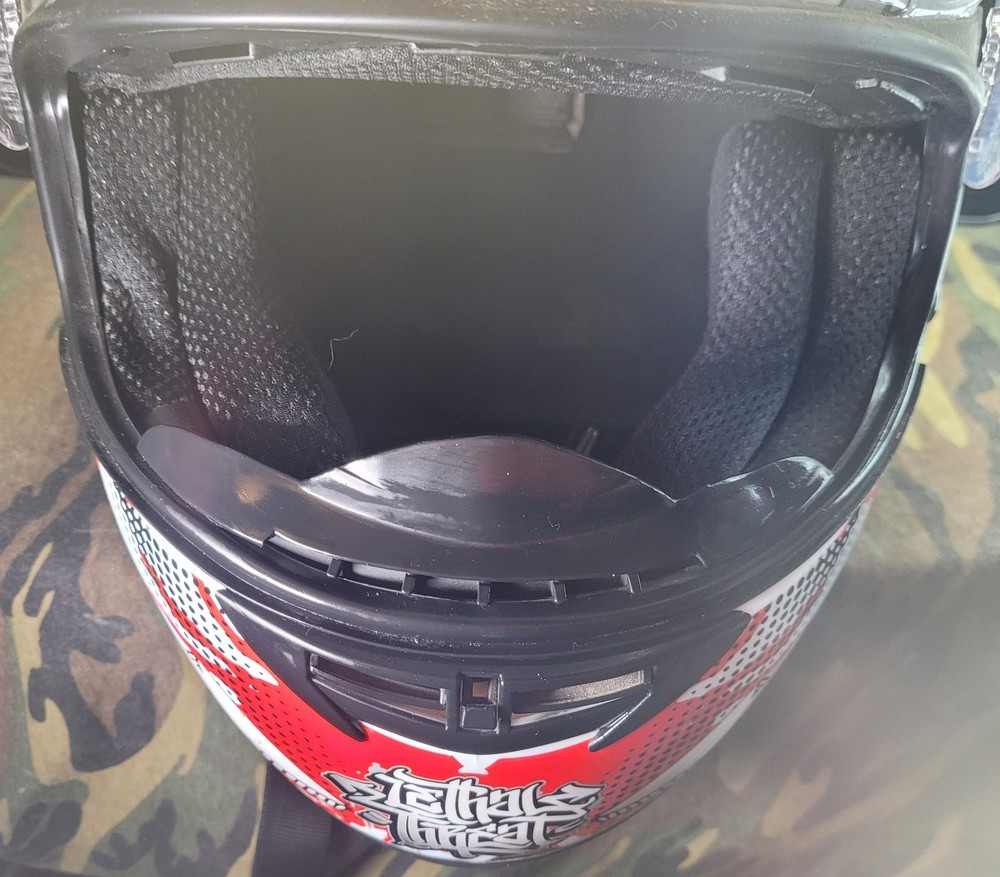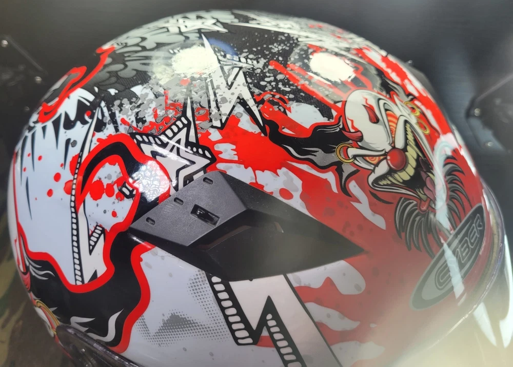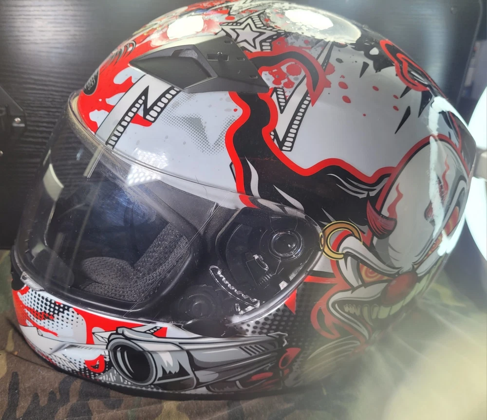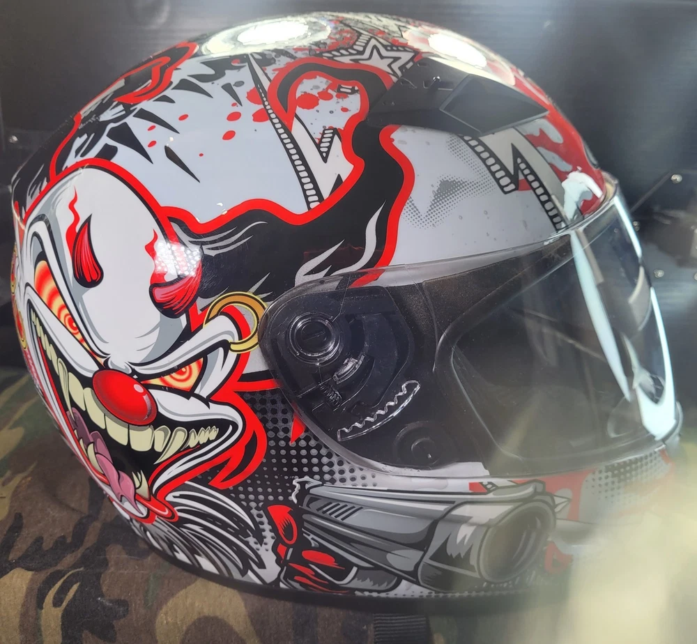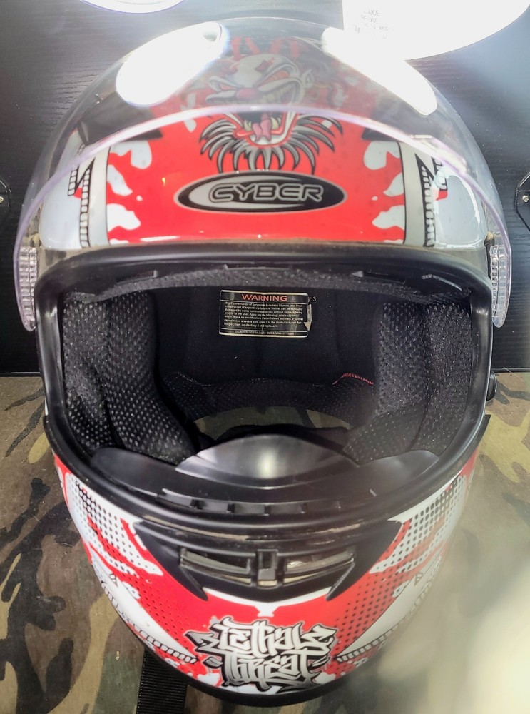 Cyber! Out of Production! US-39! Lethal Threat! Killer Clown Graphic!!! Full Face Motorcycle Helmet!!! Size Large 59-60 cm. This is a very lightly used helmet with mild scuff from storage shown in pictures. In Great Condition! Please study pictures because they are the examples that you will be receiving. Thanks for looking!!!🫡🫡🫡 (Please mention if you need more gear. I'm LOADED!)