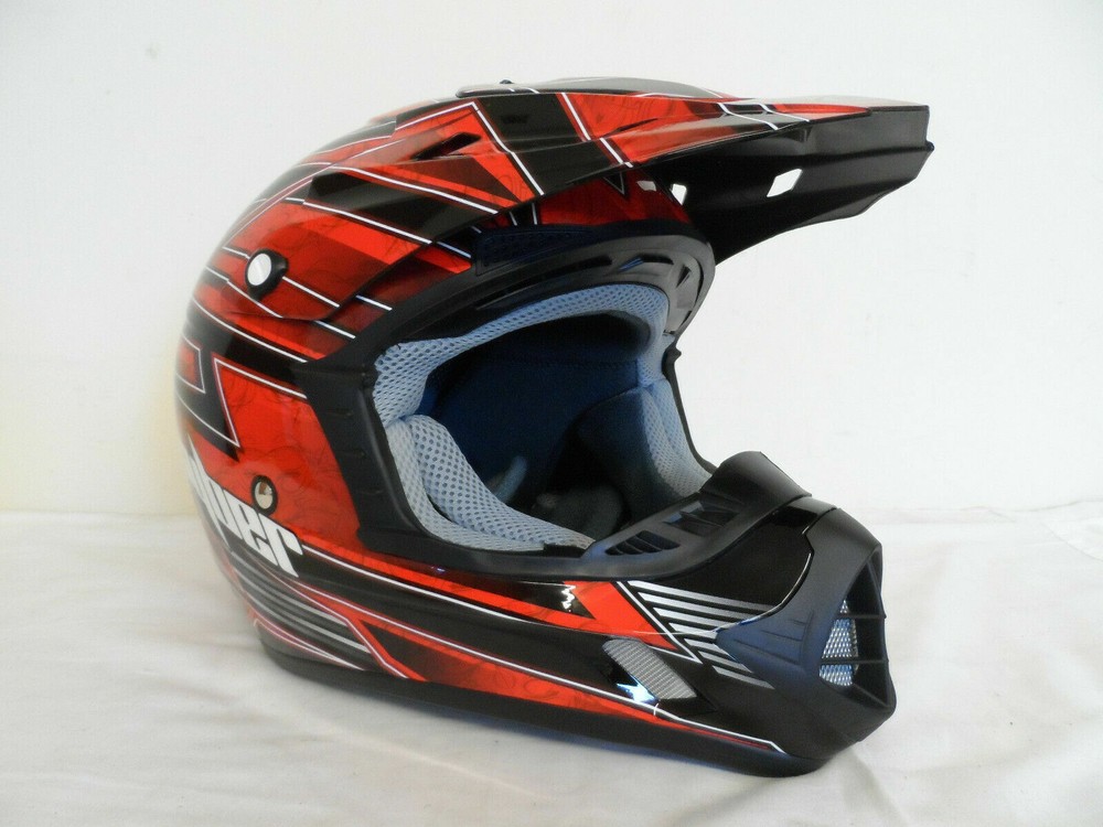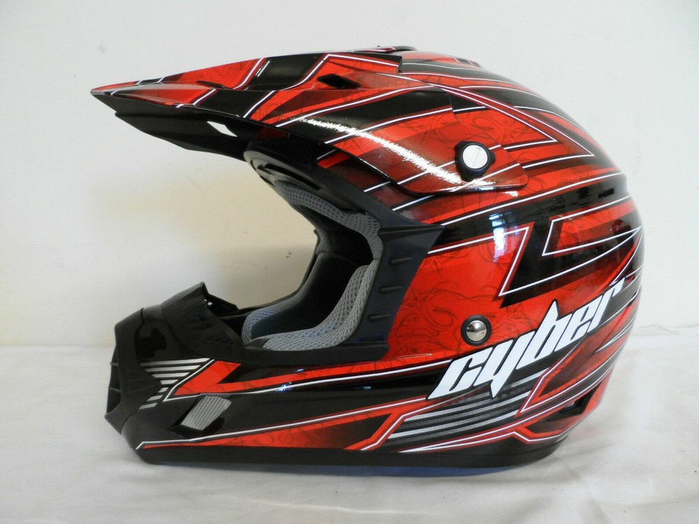 Thanks for Checking out our Store! Up for sale is a Brand New custom return Cyber UX-24 Bandit Helmet. See condition report below. Impact resistant adjustable visor. Removable and washable interior. Double D-ring retention system. Meets or exceeds D.O.T. and ECE standards. Sold individually. SIZE : MEDIUM COLOR : RED / BLACK Manufacturer Part # Condition: Brand New..never used. Returned because there is a small paint nick near the mouth area on the front of the helmet. The adjustment nut for the visor also has some scuffs under it. Helmet has a few light hairline scratches around on it but they are too light to pick up on camera. Will be difficult to notice unless you are up close. See photos. Thanks for Looking and Good Luck! Don't forget to check out our other Auctions Along with Our Ebay Store for More Great Deals! CY0422 Flat rate shipping applies only to lower 48 states.