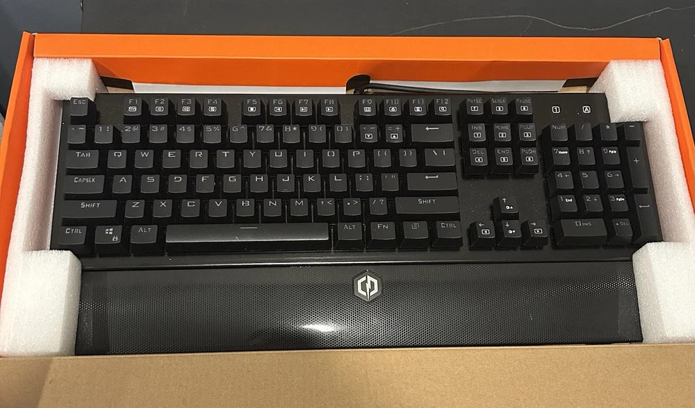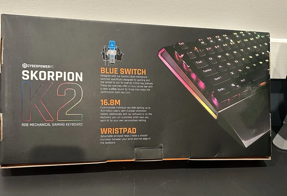 Cyberpower Skorpion K2 RGB Mechanical Keyboard - Blue switches USB mechanical gaming keyboard RBG Lighting detachable wristpad Cyberpower branding Blue clicky switches box included, some dents in box only Sold Used, As is Keyboard tested and working
