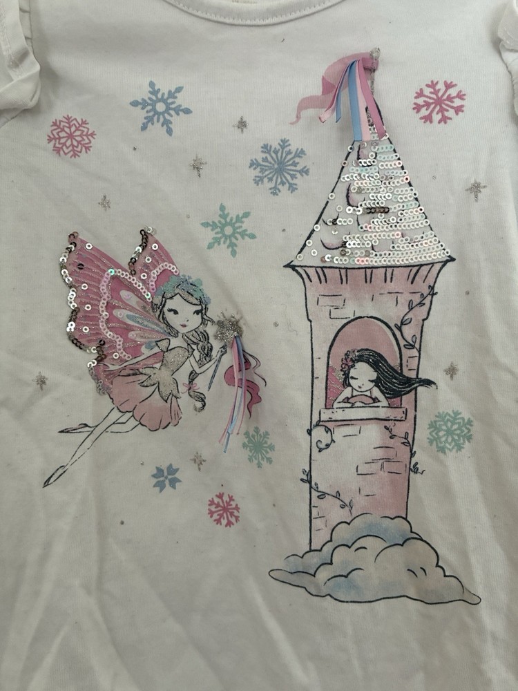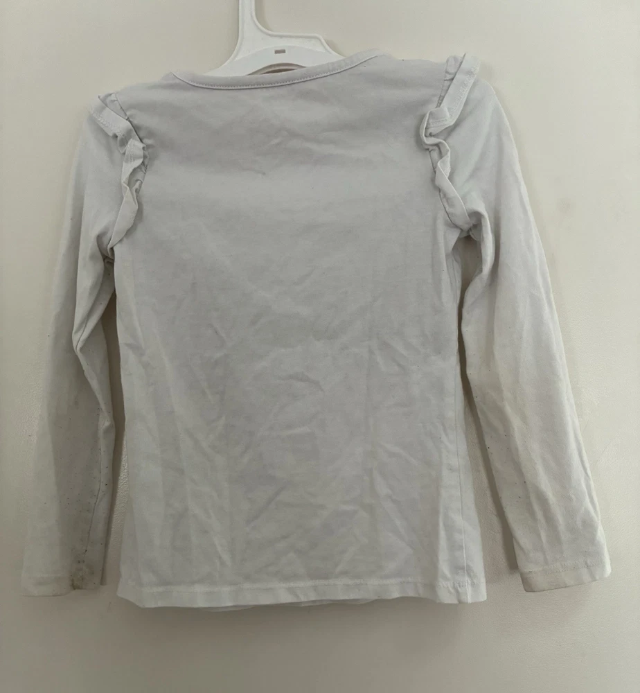Cynthia Rowley Kid Girls Glitter Sequin Fairy Cotton Blend Ruffle Shirt White XS 4. Condition is pre-owned. Smoke free, pet free home. Shipped via USPS Ground Advantage. In fair condition. There are stains on the front and the sleeve. The piece of fabric on the inside of the shirt that covers the stitching securing the sequins came off. Free of rips.