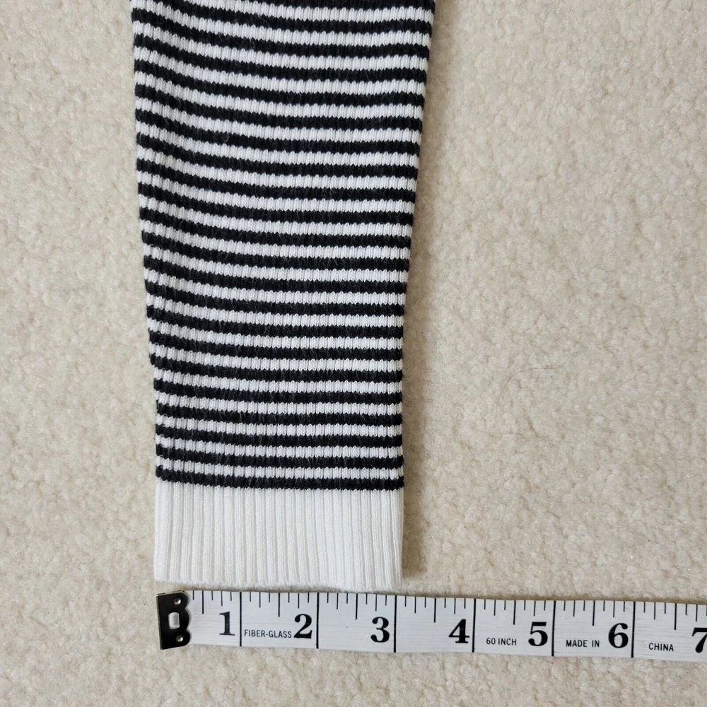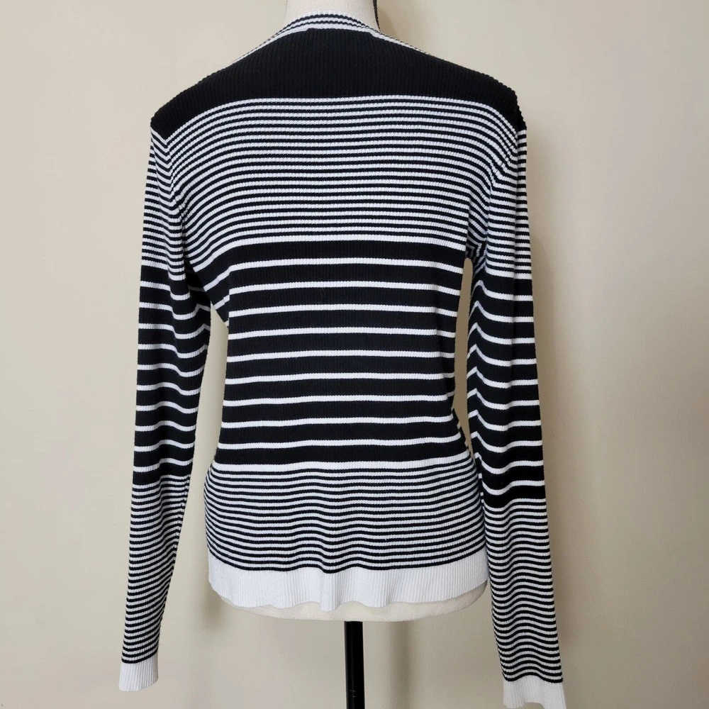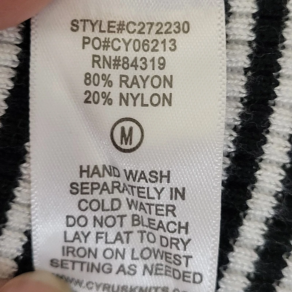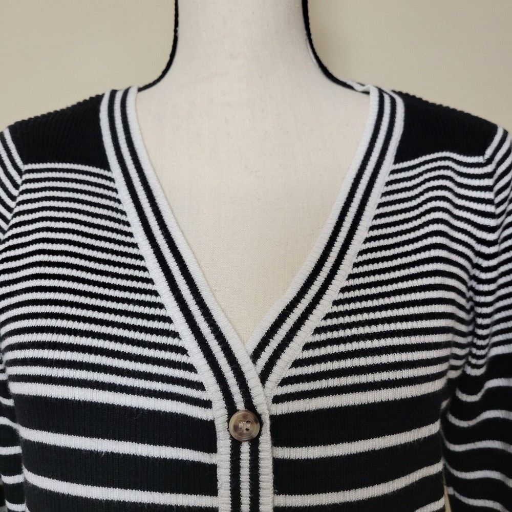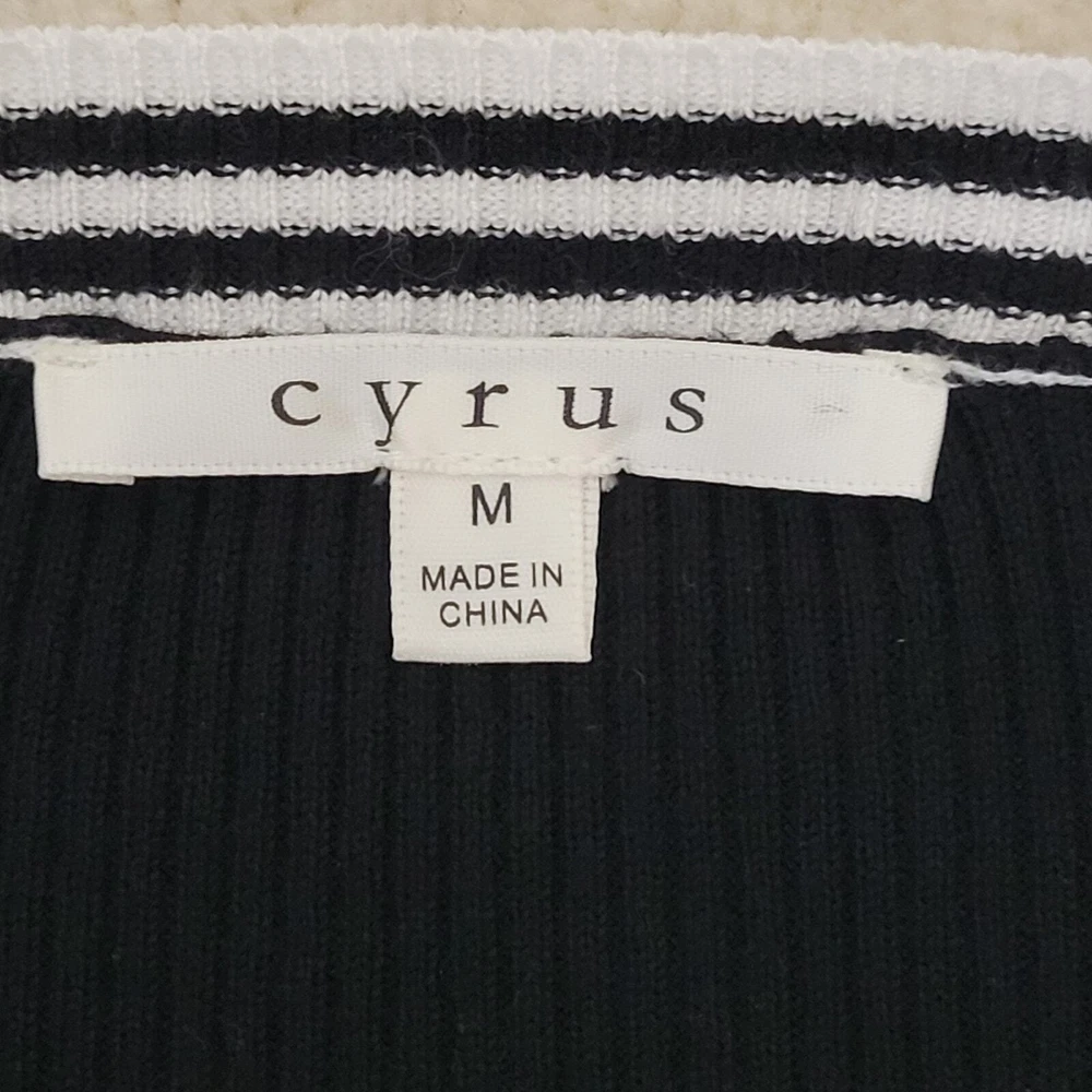 Cyrus Women's Button Front V-Neck Long Sleeve Knit Cardigan Sweater Size-Medium V-Neck Long Sleeve 5 Button Front Closure Stretch Color-Black & White Stripe Lightweight Knit 80% Rayon 20% Nylon Hand Wash/Dry Flat Measurements Laying Flat Approximate: Shoulder To Shoulder-17.5" Armpit To Armpit-20" Sleeve-24" Shoulder Seam To Wrist Lenght-22" Pre-owned In Nice Condition Every Effort Has Been Made To Accurately Describe & Photograph This Item. Some Color May Vary Depending On Lighting & Device Used To View. Please Reach Out If You Have Questions Prior To Purchase. I Am Happy To Help. Shipping From A Smoke & Pet Free Facility. USPS Ground Advantage Reasonable Offers Considered