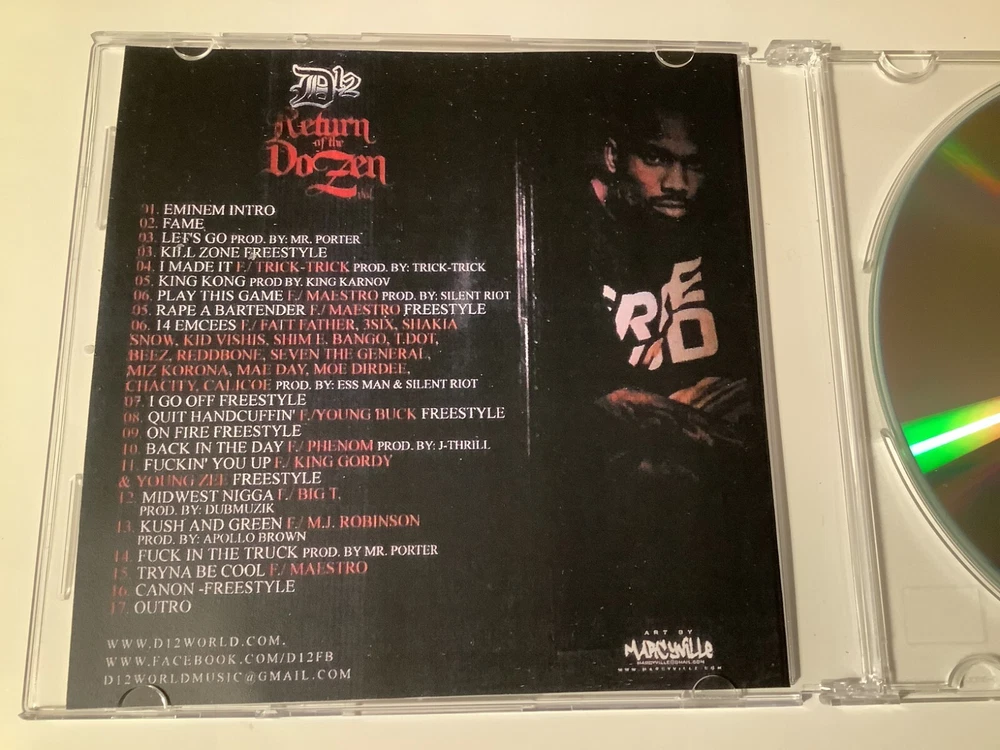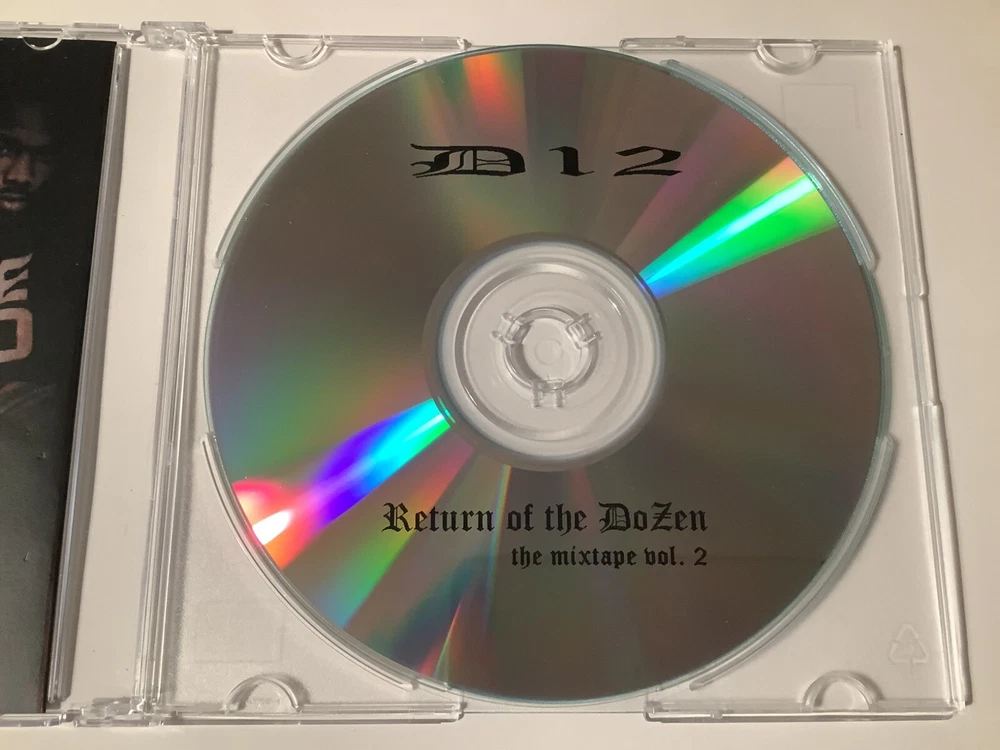 Rare D12 & Eminem Return of the Dozen vol. 2 promo mixtape from 2011 featuring exclusive material. Note the tracklist on the back cover is incorrect it mistakenly shows 2 different tracks that are supposed to be track #3, #5 and #6 so there are actually 20 songs on this release not 17 as shown. Original CDr, insert and slimcase are like new disc has been tested all the way through and plays perfectly, no extra shipping charge for additional purchases.