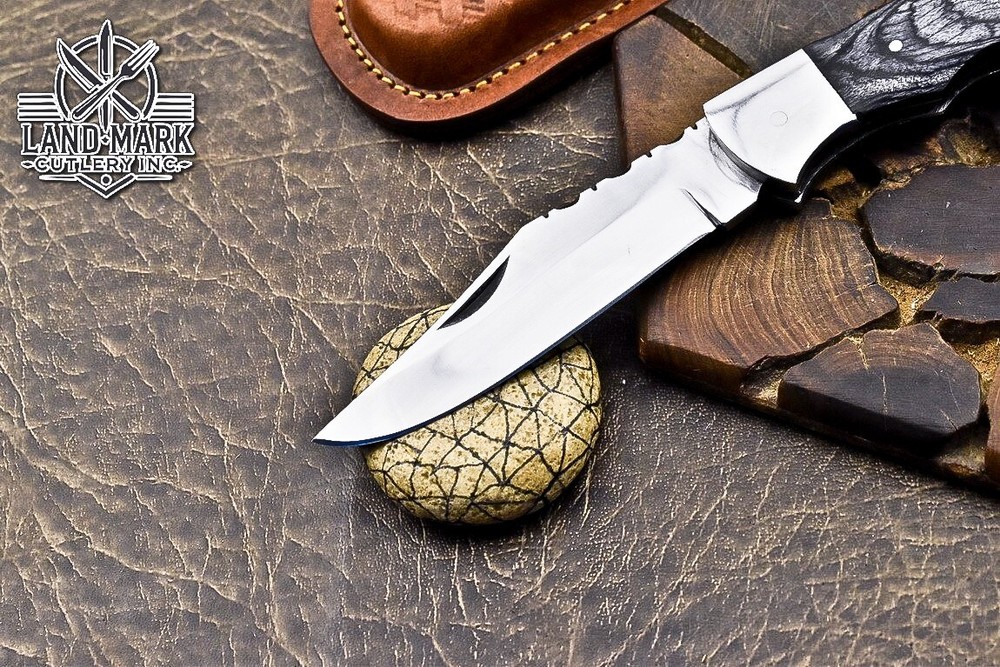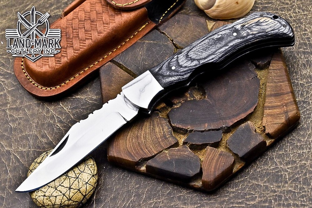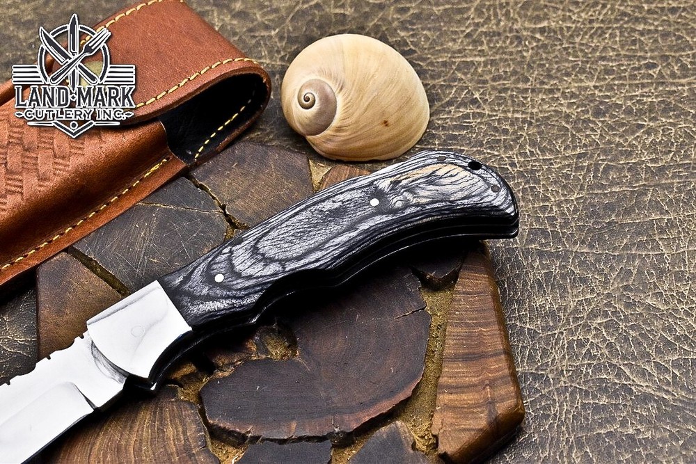 Custom Hand Made D2 STEEL HUNTING BACK LOCK FOLDING KNIFE WITH PAKKA WOOD HANDLE We offer a shipping discount for More then one purchased . And discount will be apply on combine invoice, Discount will not apply on separate payment. ITEM DETAILS OVER ALL LENGTH 7 - 8 inches long (Approx) HANDLE LENGTH 3.8 - 4 inches long (Approx) BLADE LENGTH 3.1 - 3.3 inches long (Approx) BLADE HARDNESS 58-60 HRC Which Holds The Sharp Edge For Long Time. HANDLE PAKKA WOOD COVER LEATHER SHEATH This Awesome custom made KNIFE has a nice hand forged with the combination of 4340 & 1080 steel. HOW OUR DAMASCUS IS MADE: All our Damascus is real and not just an acid etch. Damascus is a mixture of 1080HC and 4340 nickel carbon. You heat them up together and then fold the bar over and over to get the desired layers, ours are 396 layers. Then you burn the blade in acid, and it turns the nickel satin color and the high carbon turns blackish gray. This is how the layers are exposed to show the layers of the new steel created coined "Damascus". All Damascus is acid etched to show the layers. If you high polish the metal it will be shinny satin like all steels. Only after you burn the sides of the blade with acid do you see the layers of the two steels. Makes sense? After we make our knives we high polish the handles and put an edge on the blade. The high polishing buffs off the acid burned layer of the handle, and the blade edge is sharpened and the acid burned edge becomes satin. You can re-burn the tang of the blade near the handles and the edge of the blade and it will show the layers once more. All our knives are hand made, durable and unique ***** YOU WILL RECEIVED THE SAME KNIFE Qality Standards Our Damascus blades are made from high quality non-stainless steels which rival or exceed any Damascus blade made from the 10 series with 4340. Our Damascus combination has taken years to perfect and has been tested under a variety of application which will offer professional performance in categories of toughness, strength (lateral stress) and edge honing and holding ability. In a 5 spot Rockwell test our blades will average near or close to 58 which offers a perfect balances between its toughness and strength.Our blades due to carbon content need to be regularly treated with wax and/or 3 in 1 oil to maintain its superior quality. Questions if you have any question feel free to send us message we aim to answer all questions within 24 hours Feedback If you are not satisfied with our service please contact us before leaving any negative or natural feedback. We will resolve all issues as quickly as possible. Disclaimer We are not responsible for any injuries associated with the use of our tools. Our products are intended for legal use only by responsible buyers. Therefore, we will not sell our products to anyone under the age of 18. Before bidding please check your country laws as some countries Custom don't allow this. If your purchase is held by Custom Authorities in your country/State we will not be responsible for that and no refund will be issued Shipping We offer a 20% shipping discount for More then one purchased . And discount will be apply on combine invoice, Discount will not apply on separate payment We ship within 24 hours after receiving complete payment but this can be delayed due to week ends or Governments and Religious Festivals . . This is beyond our control and we apologize for this inconvenience. Precautions Our Tools are very sharp so open and use them very carefully We are not responsible for any injuries associated with the use of our tools Tips to Care knife 1. NEVER STORE YOUR KNIFE FOR LONG TIME IN LEATHER SHEATH. 2. LEATHER CAN ABSORB WATER, WHICH WILL RUST THE KNIFE. 3. ALWAYS CLEAN THE BLADE AFTER USING WITH OIL OR WAX