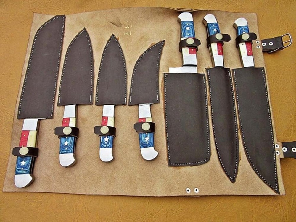 D2 Steel Knife Custom Handmade Camel Bone Handle Chef knife Set Lot 7 MEASUREMENTS OVERALL LENGTH = 17" to 8" INCHES HANDLE LENGTH = 5.00 to 6.00 INCHES THICKNESS = 3 mm to 4 mm CAMEL BONE & COLOR WOOD HANDLE WITH STAINLESS STEEL BOLSTER D 2 STEEL BLADE Hand Stitched Leather Sheath