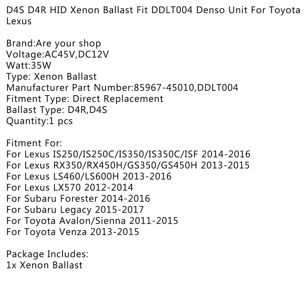 You may also like Smoke Black Housing Side Headlights/Lamp Assembly For GMC Sierra Yukon XL 99-06 49.85 USD Free shipping Xenon Ballast HID D3S Bulb Lamp Control Unit 68170821AA For Chrysler 300 UE 42.85 USD Free shipping D4S D4R Xenon Ballast Bulb Control Unit HID 86996-51085 For Toyota Prius 06-09 39.85 USD Free shipping Led Ballast Unit Control A2059005010 For Mercedes-Benz W205 C Class 2015-2018 59.85 USD Free shipping 10X For HELLA LED Retrofit 1156W LED P21W 12V 3W BA15S 6000K 41.85 USD Free shipping H3 For OSRAM NIGHT BREAKER PLUS Headlight Lamp Up to +90% Light 12V55W 64151NBP/ 15.85 USD Free shipping H8 For`Philips CoreDrive Halogen Fog 12360CDC1 12V 35W PGJ91-1 M2 11.85 USD Free shipping For PHILIPS Car Lamps 12V 2W BA9s 12913CP 10 Pieces UE 12.85 USD Free shipping Headlight Ballast Control Unit Module 8K0.941.597.B Fit For Audi VW 34.85 USD Free shipping Xenon Headlight Ballast Control Unit Module A2229003300 For Mercedes CLA GLA 32.85 USD Free shipping Black Housing Clear Side Headlights/Lamp Assembly For GMC Sierra Yukon XL 99-06 42.85 USD Free shipping For Philips 11012U90CWX2 Ultinon Pro9000 LED-HL HIR2 12V 20W +350% 5800K 161.85 USD Free shipping D4S D4R HID Xenon Ballast Fit DDLT004 Unit For Toyota Lexus Brand:Are your shop Voltage:AC45V,DC12V Watt:35W Type: Xenon Ballast Manufacturer Part Number:85967-45010,DDLT004 Fitment Type: Direct Replacement Ballast Type: D4R,D4S Quantity:1 pcs Fitment For: For Lexus IS250/IS250C/IS350/IS350C/ISF 2014-2016 For Lexus RX350/RX450H/GS350/GS450H 2013-2015 For Lexus LS460/LS600H 2013-2016 For Lexus LX570 2012-2014 For Subaru Forester 2014-2016 For Subaru Legacy 2015-2017 For Toyota Avalon/Sienna 2011-2015 For Toyota Venza 2013-2015 Package Includes: 1x Xenon Ballast -About US Founded in 2012, VIPJQ have professional development and sales, and are involved in various products, providing customers with various high-quality products. Since its establishment, VIPJQ has always adhered to the service concept of "customer first" and the management concept of "pursuit of quality", and is committed to providing customers with high-quality original designs. We commit to provide you the best innovative, quality products & professional services with competitive prices. We value every customer, and we look forward to providing solutions for your business needs to help your business achieve its goals, please contact us immediately! We are all about you! We are a Japanese seller,but with large warehouse in USA. We are profesional on Auto Parts,Car Parts,Motorcycle Parts,3C,other hot sale items and so on. We aim to provide to customers high quality product and best service. -About Shipment&Returns The item usually will be dispatched within 3 days after you ordered.All are free shipping. And it usually takes 3-10 working days to delivery depends on buyers' address or other majeure on the way. If you are not satisfied with the items and want to return the item,we hope you could message us first,we will give you the return details, we think we could give you the best service to save your time and money.Thank you. -About Feedback&Customer Service If you are enjoy your shopping here,not only enjoy the items but also the service,we are appreciate you could give us a 5-star feedback. If you are not satisfied with the item,before you give us the negative feedback,we hope we could give you the best solution through our commutication. We think we could do it if you give us the chance.Thank you.