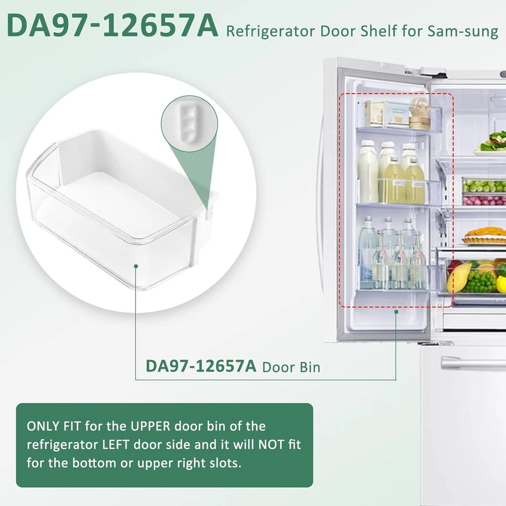 DA97-12657A Compatible for Samsung RF263beaesr RF260beaesr RF261beaesr Samsung Fridge Shelf Replacement by MIFLUS,Left Side Samsung Refrigerator Parts/Samsung Refrigerator Door Shelf Bin Product Details FIT SAMSUNG REFRIGERATOR MODEL:Series of RF26HFPNBS,RF260BEAESR,RF261BEAES,RF261BEAEBC,RF261BEAEWW,RF260BEAESG,RF260BEAESP,RF260BEAEBC,RF260BEAEWW,RF262BEAESR.Please continue browsing,we describe the full range of applicable models on the details page. Use "CTRL+F"to help you find your model to see if it fits samsung fridge door shelves EASY TO USE SAMSUNG FRIDGE REPLACEMENT PARTS:No tool needs to install DA97-12657A samsung refrigerator door shelf,only takes five minutes or less,After washing the refrigerator door shelf bin,slide the door shelf bin into the door just above the desired location and push it down until this sam-sung fridge replacement shelf snaps into place.Very simple,save a lot of money SAM-SUNG REFRIGERATOR DOOR SHELF BIN DA97-12657A:Only spend little to repair your DA97-12657A refrigerator samsung refrigerator door shelf replacement DA97-12657A made of PE material with non-polluting,safe,hygienic,sturdy and unbreakable.Choose our samsung refrigerator door shelf replacement DA97-12657A let you use more at ease AFTER-SALES SERVICE:Your satisfaction is our top priority.If you're not satisfied with the DA97-12657A samsung refrigerator shelf replacement ,We will give you acompensate or resend the goods according to the actual situation.Any question regarding the DA97-12657A samsung fridge door shelves,Please feel free to contact us
