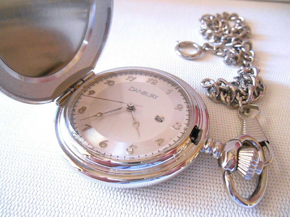 Please note: We do have a cat. Please read description before bidding. Up for bid is a Danbury silvertone pocket watch engraved "AJ" with chain. New battery. Measurement in the pictures. It is in good condition. Photo is of the actual item. I accept several different methods of payment. Payment must be made within 4 days after the close of the auction. *Combined shipping is available. **We ship to Alaska and Hawaii. ***Taxes and fees are the responsibility of the buyer.