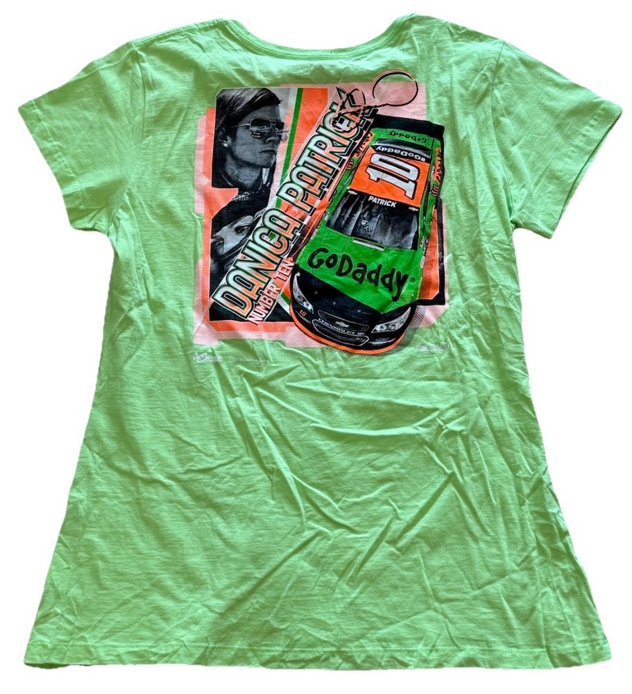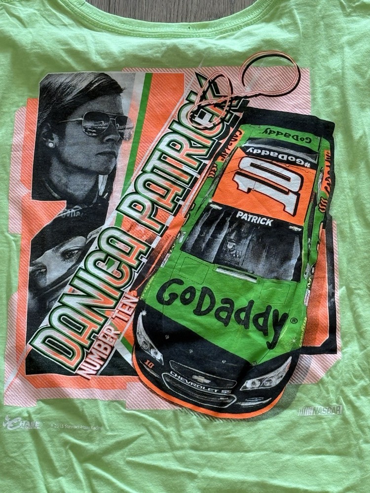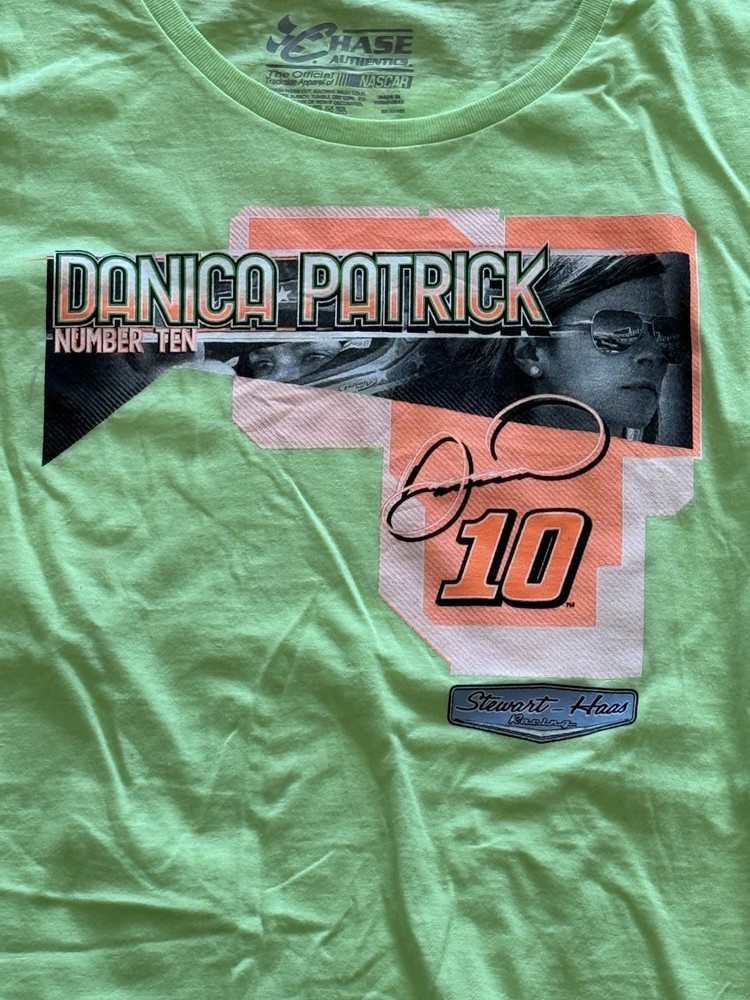 The product is a green women's XL shirt featuring NASCAR driver Danica Patrick, who drives the #10 car for Stewart-Haas Racing. The shirt is officially licensed and made by Chase, a popular brand in the auto racing industry. This Y2K racing shirt is perfect for fans of Danica Patrick and NASCAR auto racing, showcasing their love for the sport and admiration for the talented driver.