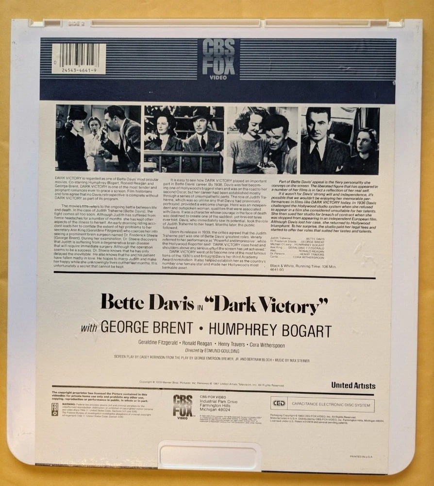 Movie/TV Title: Dark Victory gtin13: Does Not Apply Actor: Bette Davis, Humphrey Bogart Format: CED Studio: CBS FOX UPC: Does Not Apply Seller Notes: “Good condition. Have not tested play back quality.” Type: Movie