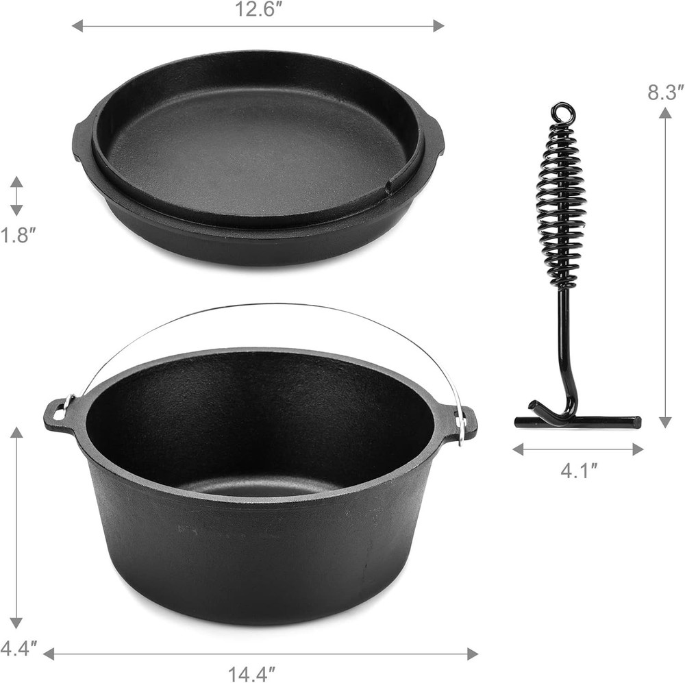 DARTMOOR 9 Quart Pre-Seasoned Cast Iron Dutch Oven with Lid and Lid Lifter Tool Outdoor Deep Camp Pot for Camping Fireplace Cooking BBQ Baking Campfire 9 QT Description: CAST IRON CONSTRUCTION IN SEASONED FINISH, constructed of cast iron and processed with seasoned finish technologies, this deep camp Dutch oven is sturdy enough to stand up to extreme outdoor environment. DOUBLE AS A SKILLET OR GRIDDLE, lid with legs can be used as a skillet/griddle, allowing you to enjoy fry food even in camping. CHEMICAL-FREE PLANT OIL COAT, chemical-free plant oil coat brings non-stick using experiences, safeguarding your health without compromising convenience. USER-FRIENDLY DESIGN, deep dish lid increases air flow for even cooking; convenient loop handle on lid makes this pot easy to carry around; built-in thermometer notch for detecting food temperature. DUTCH OVEN LID LIFTER INCLUDED, comes with a Dutch oven lid lifter for your safety and convenience.