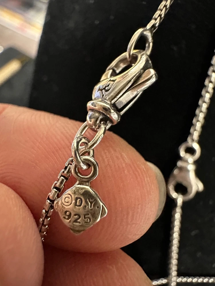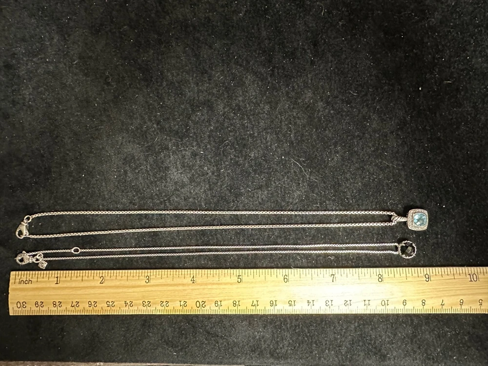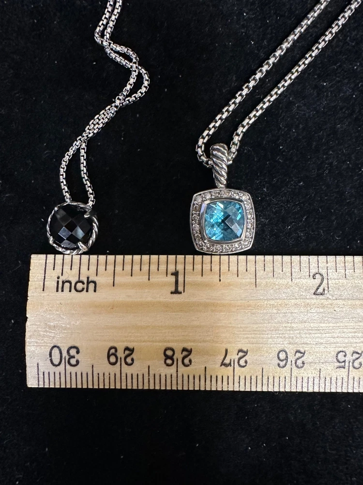 TWO GORGEOUS DAVID YURMAN NECKLACES IN EXCELLENT PRE-OWNED CONDITION. BOTH HAVE BOX CHAINS AND LOBSTER CLOSURES THAT FUNCTION PROPERLY. ONE IS CIRCULAR AND HAS A FACETED ONYX STONE IN BEAUTIFUL CONDITION. THE OTHER IS A SQUARE PETIT ALBION TOPAZ SURROUNDED BY PAVE DIAMONDS ALSO IN EXCELLENT CONDITION. PLEASE VIEW ALL PHOTOS FOR MEASUREMENTS AND CONDITION5.