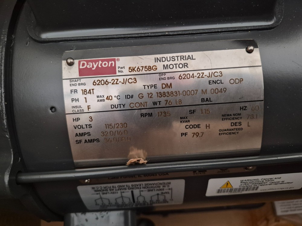 5K675BG DAYTON General Purpose Motor: Single Phase, 3 hp, 115/230V AC, 184T Frame Size, 1 1/8 in x 2 3/4 in Product Details Catalog Page 8 Brand DAYTON Manufacturer Part Number 5K675 Phase Single Horsepower @ 60 Hz 3 hp Nameplate Voltage @ 60 Hz 115/230V AC Nameplate RPM @ 60 Hz 1,735 RPM Nameplate Service Factor @ 60 Hz 1.15 Full Load Amps @ 60 Hz 32.0/16.0 A Frame Size 184T Frequency 60 Hz Insulation Class F Output Shaft (Dia x L) 1-1/8 in x 2-3/4 in Shaft Diameter 1-1/8 in Shaft Length 2-3/4 in Motor Design Capacitor-Start Mounting Type Rigid Base Motor Enclosure Type Open Drip Proof Motor Shaft Rotation CW/CCW Motor Thermal Protection None Nominal Efficiency 78.1 % Number of Speeds 1 Ambient Temperature - Maximum 40 °C Product Type General Purpose Motor Application General Purpose Bearing Type Ball Duty Cycle Continuous Frame Material Steel Length Less Shaft 11-3/8 in Mounting Position All Angle Overall Length 15-3/4 in Shaft Design Keyed Manufacturers Warranty 1 yr Standards CSA (225293); UL (E47479) UNSPSC 26101602 Country of Origin Varies (subject to change) Product Description Rigid base single-phase AC motors have a metal foot base welded to or cast as an integral part of the motor shell.