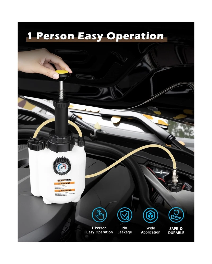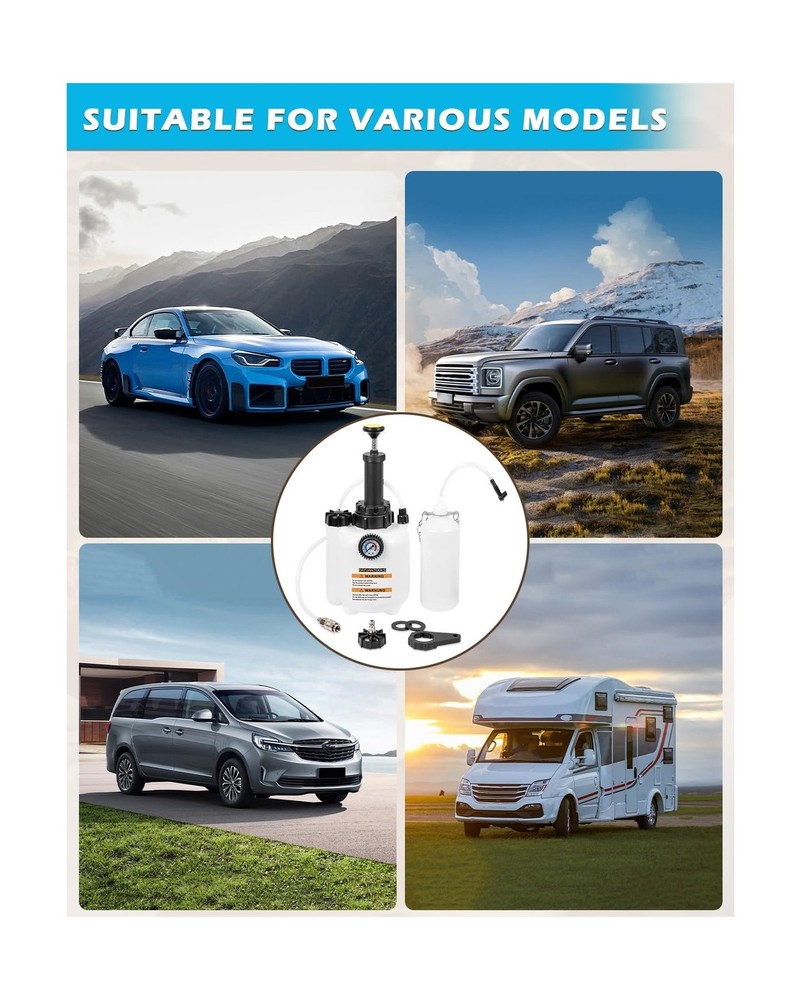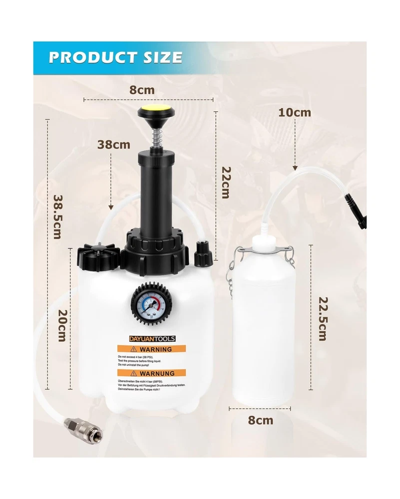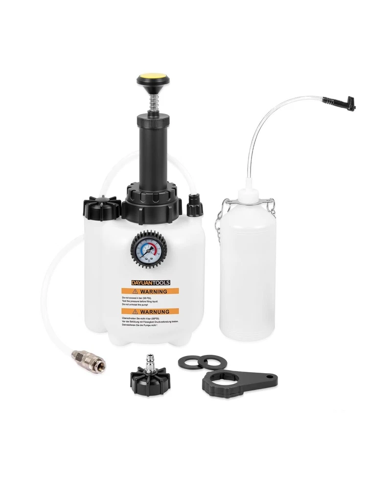 DAYUAN 3L Hand Brake Fluid Bleeder Bleeding One Man Tool Kit for Most European Models Description Features: Made of sturdy plastic, this brake bleeder is ideal for home use. It can absorb three liters of liquid and is thus used in European car models. The sturdy plastic makes it not only easy to clean, but also robust and facilitates brake bleeding on a wide variety of vehicle types Quick release and locking chuck with Euro ports Standard Adapter E20(45mm, 1.8") for most European Models Capacity of 3 liters with 1L suction tank Including detailed description and safety instructions Product Details: Manufacturer: Yinyuan Tools Brand: DAYUAN Item Weight: 3.63 pounds Package Dimensions: 17.01 x 7.44 x 7.05 inches Item model number: YT-85430 Manufacturer Part Number: YT-85430 Date First Available: August 21, 2023 Delivery We Do Not Ship Outside of the Continental US. Return Policy All items qualify for returns within 30 days of receipt. Buyer is responsible for return shipping on any item that is not damaged. Feedback We take our reputation seriously, we buy and sell online, so we understand the value of trust. If you are unsatisfied with your order, please contact us and we will work with you to resolve it to your satisfaction.