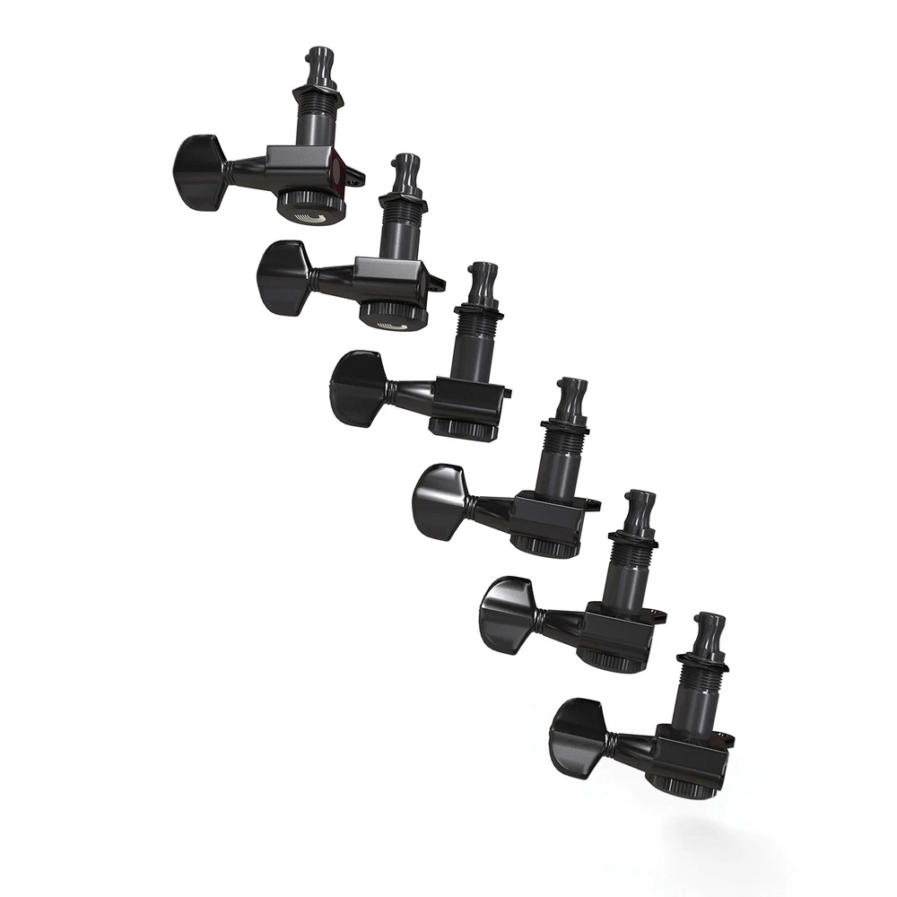 Product Description Features: - Patented Ned Steinberger design cuts excess string while guitar is tuned, eliminating need for extra string-cutting tools. - Individual string clamps securely hold string in tuner - no need for multiple wraps around the tuning post. - Excellent for aggressive tremolo use. - Precision 18:1 gear ratio provides smooth, exact tuning, while virtually eliminating backlash and slippage. From the Manufacturer The 6-in-line Auto Trim Tuning Machines are precision tuners that automatically cut the excess string while changing strings, eliminating the need string clippers making string changes easy and fast. The 18:1 ratio worm gear constructions ensures greater precision than standard tuners and ensure tuning stability even during the hardest playing. Includes 6 tuners and mounting hardware. Black finish. 6 in-line setup for instruments that have all 6 tuning machines on the same side of the headstock. Ordinarily, restringing is a tedious chore, requiring extra tools such as string cutters in order to get the job done. Auto-Trim tuners eliminate this need by automatically trimming the excess string from the tuning post as you increase the tension on the string. The Auto-Trim's rugged, die-cast housing and precision machined 18:1 bevel and worm gears assure in-tune performance after even the most aggressive playing or tremolo use. The tuners include a string clamp that securely hold the string in place, eliminating the need for multiple wraps around the tuning post. Simply insert the string, tighten the clamp, tune it up to the proper tension and allow the auto-trim feature to remove the excess string. Changing strings has never been easier. A Ned Steinberger Design. , part of the D'Addario family of brands, is known for innovative, problem-solving, quality musical accessories. offers a complete line of award-winning accessories including cables, picks, tuners, capos, straps, humidifiers, maintenance tools and more. AUTOMATICALLY CUTS EXCESS STRING WHILE TUNING: Trims excess string while tuning to ensure consistent and accurate tuning. EASY STRING CHANGES: The locking tuners make changing strings fast and easy. SMOOTH AND PRECISE TUNING: The sealed gear box with lubricated gears ensures smooth and precise tuning. UNIVERSAL FIT: Fits most 6-in-line electric and acoustic guitars without drilling or modification. ATTRACTIVE FINISH: Adds a sleek and modern look to your guitar while providing reliable tuning performance.