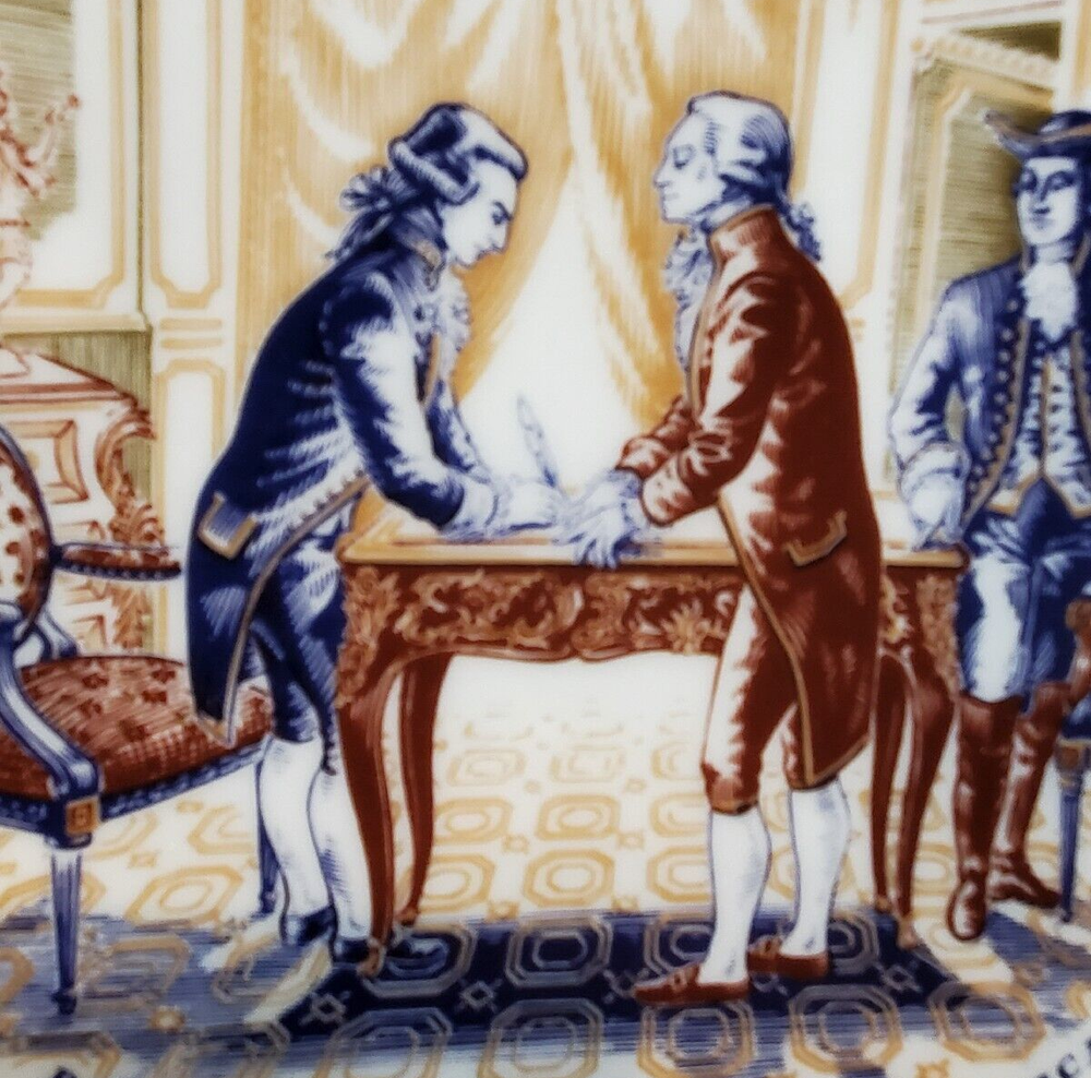 Vintage D'Arceau Limoges SECRET CONTRACT Collectors Plate. This collectible plate is part of a series of 6 plates from the 1970s. The plates reflected different scenes of the revolutionary war and have a story on the back written in French. Plate measures 8 1/2" across . Has no chips or cracks and comes in the original box as shown.