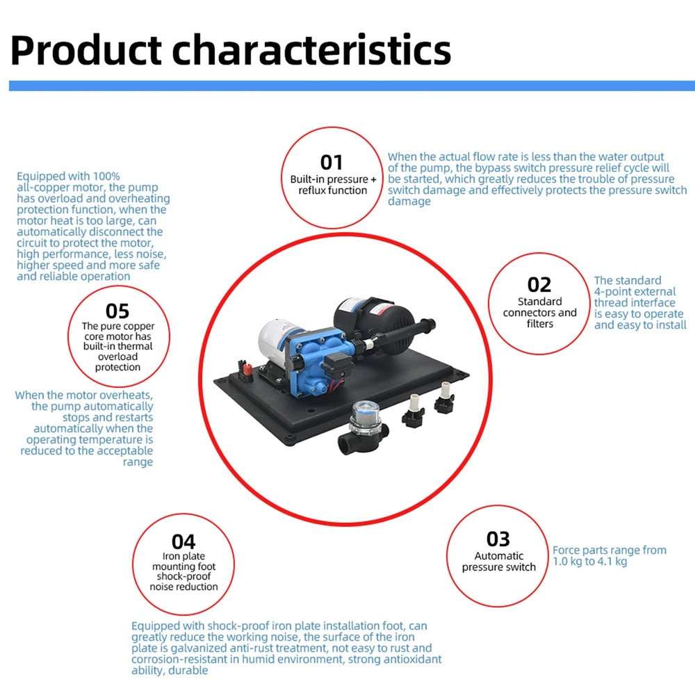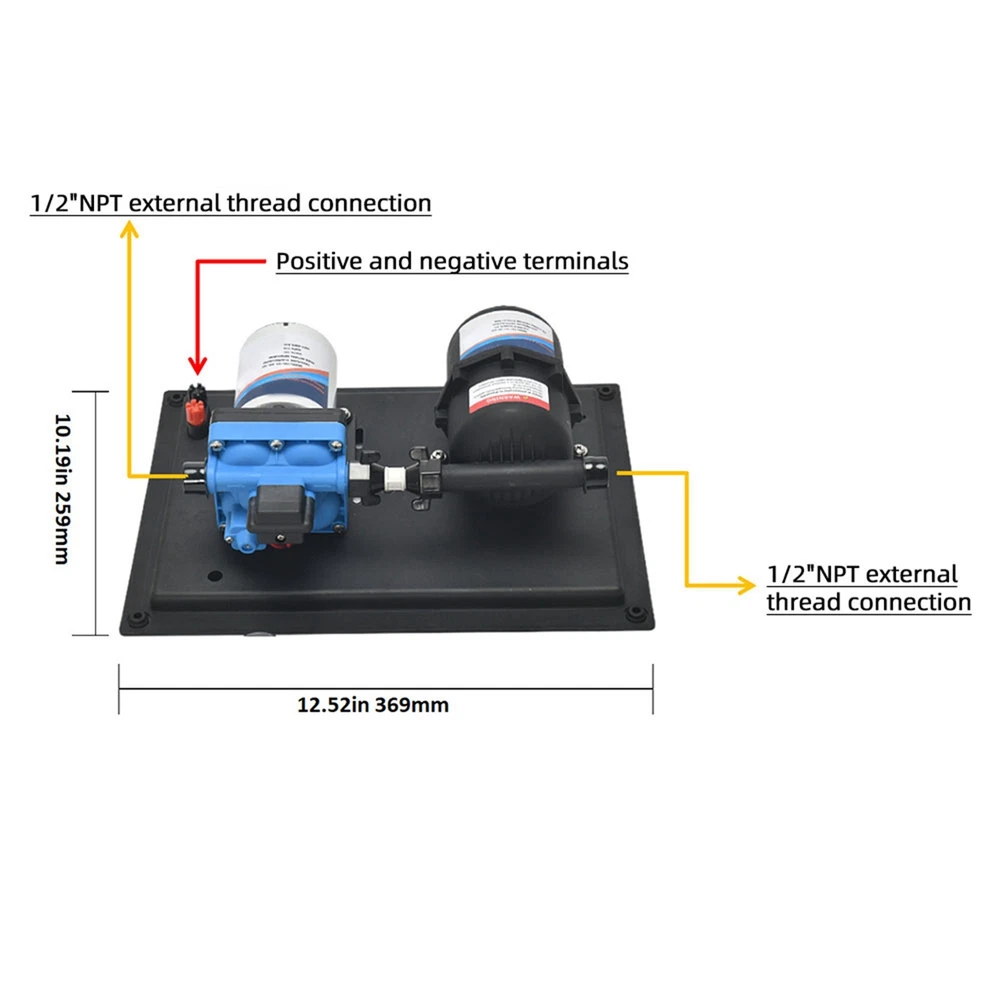 Features: 【 and Efficient】: This DC 12V boost water pump kit features a powerful motor and a rate of 3GPM (11.3L/Min) at 55PSI, ensuring a steady and consistent water supply. The built-in thermal overload protection automatically stops the pump when the motor overheats, providing peace of mind and preventing damage. 【Versatile and Easy to Install】: Designed with a standard 4-point external threaded interface, this water pump is easy to operate and quick to install. The automatic pressure switch allows for adjustable pressure ranging from 1.0kg/cm² to 3.5kg/cm², catering to various needs. The shock-proof iron plate mounting feet effectively reduce noise and the galvanized prevents rusting, making it even in humid environments. 【Powerful and 】: Equipped with a high-quality copper core motor, this water pump delivers superior performance, low noise, and higher rotation speed for safer and more . The motor also features overload and overheat protection, automatically disconnecting the circuit to the motor. With its exceptional durability and anti-oxidation ability, this pump is built to last. 【Integrated Water Pressure System】: Our RV water pump comes with a pressure tank, providing a stable and water supply. The integrated system offers multiple configuration options to suit different applications, including yachts, RVs, agricultural irrigation, industrial use, fluid transfer, water purifier boosting, solar water systems, home water supplementation, and car washing. The simple installation and of this system effectively reduce the frequency of pump start-up and absorb excess heat generated by heaters. 【Pressure-Regulating and Reflux Functionality】: This water pump is designed with a built-in pressure switch and reflux function. When the actual rate is lower than the pump's output, the bypass switch starts the pressure release cycle, greatly reducing the of pressure switch damage. This feature ensures the longevity of the pressure switch, providing optimal protection and peace of mind. Specifications: Maximum Rate: 11.3L Maximum : 38m/124ft Pump Body Material: Engineering plastic Drive Mode: Electric Pressure/ Rate: 55PSI/11.3L GPM: 3 Environmental Temperature: ≤+50 ° C Medium Temperature: 0~+65 ° C Medium PH Value: 5.0-10 The volume of solid inputs in the medium is ≤ 0.1, and the particle size is not greater than 0.2mm Power Frequency: 50Hz Voltage: DC 12V Voltage Translation Range: Rated value ± 10% Product Size: 36.9 * 25.9cm/12.5 * 10.2inch Note: Due to the different display screen and light effect, the actual color of the item might be slightly different from the color showed on the pictures. Packing List: 1 x Water Pump 1 x Filter 2 x Joint On Dec 11, 2024 at 02:55:16 PST, seller added the following information: On Dec 17, 2024 at 22:30:47 PST, seller added the following information: On Dec 26, 2024 at 20:14:39 PST, seller added the following information: