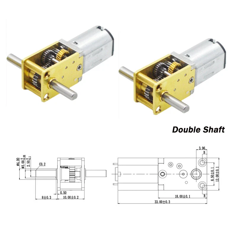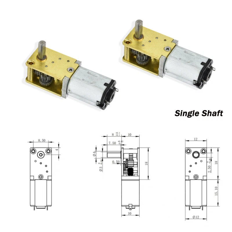 DC 3V 6V 12V High Torque Mini N20 Worm Geared Reduction Motor Full Metal Gearbox Voltage Reduction Ration No Load RPM No Load Current Load Current Load RPM Start Voltage Blocking Current Blocking Torque/gf.cm Rated Torque/gf.cm Power 12V 118:1 136RPM 30mA 85mA 119RPM 0.5V 700mA 472 142 1.02W 12V 236:1 68RPM 30mA 85mA 59RPM 0.5V 700mA 944 283 1.02W 12V 302:1 53RPM 30mA 85mA 46RPM 0.5V 700mA 1208 362 1.02W 12V 603:1 27RPM 30mA 85mA 23RPM 0.5V 700mA 1929.6 579 1.02W 12V 42:1 381RPM 30mA 85mA 333RPM 0.5V 700mA 235.2 71 1.02W 12V 1030:1 16RPM 30mA 85mA 14RPM 0.5V 700mA 3296 989 1.02W 6V 118:1 68RPM 20mA 60mA 51RPM 0.5V 350mA 206.5 62 0.36W 6V 236:1 34RPM 20mA 60mA 25RPM 0.5V 350mA 413 124 0.36W 6V 302:1 26RPM 20mA 60mA 20RPM 0.5V 350mA 528.5 159 0.36W 6V 603:1 13RPM 20mA 60mA 10RPM 0.5V 350mA 1055.25 317 0.36W 6V 42:1 190RPM 20mA 60mA 143RPM 0.5V 350mA 73.5 22 0.36W 6V 1030:1 8RPM 20mA 60mA 6RPM 0.5V 350mA 1802 541 0.36W 3V 118:1 34RPM 10mA 40mA 21RPM 0.5V 150mA 88.5 27 0.12W 3V 236:1 17RPM 10mA 40mA 11RPM 0.5V 150mA 177 53 0.12W 3V 302:1 13RPM 10mA 40mA 8RPM 0.5V 150mA 226.5 68 0.12W 3V 603:1 7RPM 10mA 40mA 4RPM 0.5V 150mA 452.25 136 0.12W 3V 42:1 95RPM 10mA 40mA 60RPM 0.5V 150mA 31.5 9 0.12W 3V 1030:1 4RPM 10mA 40mA 2RPM 0.5V 150mA 722.5 232 0.12W *IMPORTANT INFORMATION*. N20 Turbo Worm DC Gear Motor Weight : 13g Voltage:3V 6V 9V 12V Speed Error : 10% All Metal Gear Low speed, Can be forward and reverse Mute self-locking Precautions for motor use: Before use, confirm that the motor voltage is correct. If it is a DC motor, confirm whether the power supply current is sufficient. It cannot be used with overload. The cause of overload is mainly divided into two parts: torque and shaft force. The load torque cannot exceed the rated torque of the motor. The shaft force cannot exceed the axial and radial allowable force of the shaft, and the load is added. The measured current of the rear motor cannot exceed the rated current. Generally, the motor must be equipped with a fuse to avoid overloading the motor. When installing the motor, pay attention to whether the screws are too long, and do not use too long screws to the parts inside the motor