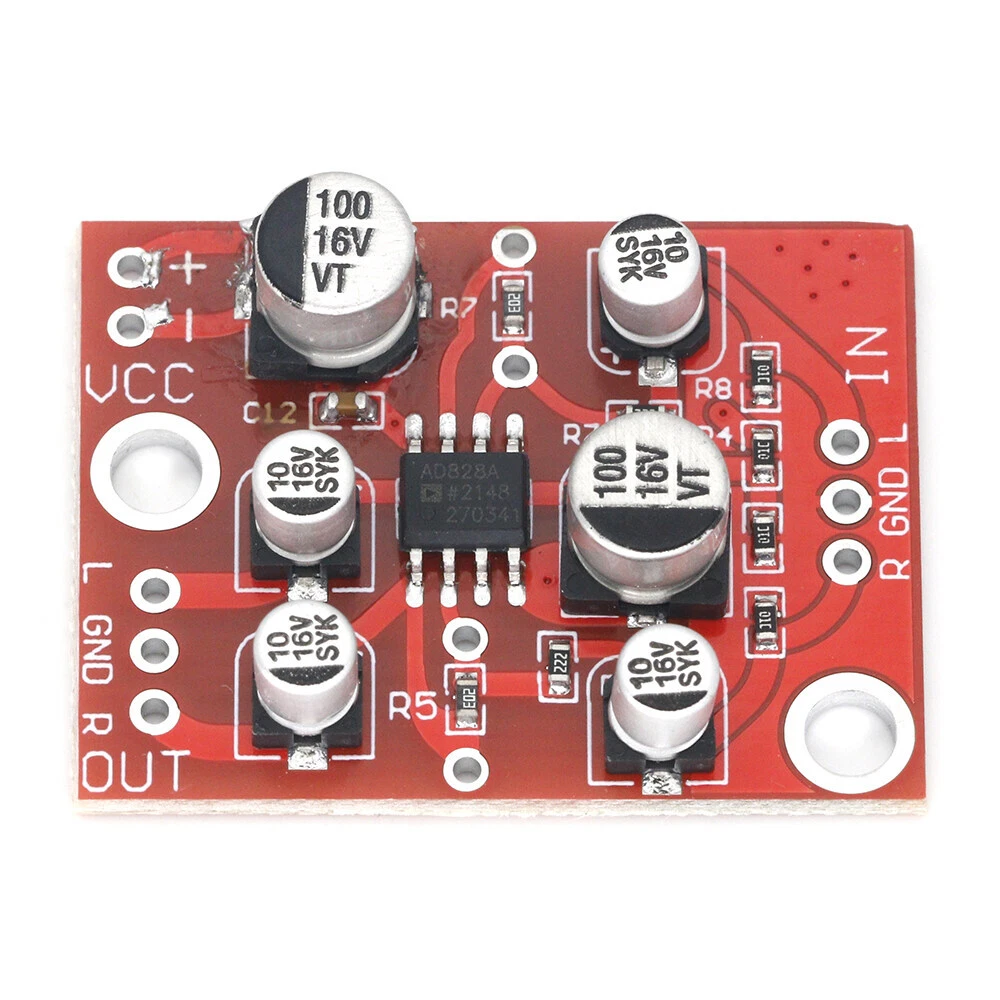 Product Introduction AD828 Operational Amplifier Front Amplifier, Audio Amplifier Module, Single Power Supply. Small volume design, full patch process, input and output coupling capacitors using imported non-polar brand capacitors, operational amplifiers using fever grade AD828 patches. Product Parameters Product Name: AD828 op amp front amplifier Product model: 005231 Chip model: AD828 Audio input: onboard interface Working voltage: 5V-15V Product size: 33mm* 25mm Instructions Magnification adjustment: R7 and R5 are the magnification setting resistance (the default magnification is about 5 times for delivery, and the magnification can be changed according to your own needs. The resistance can be selected from 5k-47k. The greater the resistance, the higher the magnification. If the plug-in resistance is used, the original patch resistance can be removed and the plug-in resistance can be welded on the reserved pads at both ends of the patch position)