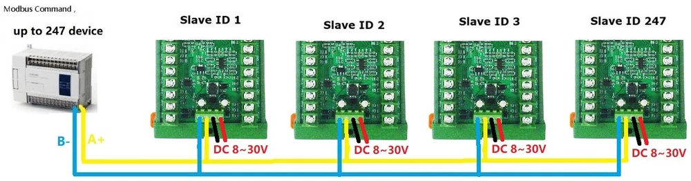 Product Name: 8ch DC 8-30V PT100 RTD RS485 Temperature Sensor Module Modbus RTU Platinum Thermal Resistance Collector -40~500C Packing list: ( Please select the product you need ): 1 PCS PTA8D08 8ch PT100 RS485 Acquisition module Description : PTA8D08 PT100 RS485 Acquisition module Description: Working voltage: DC 8~30V Working current: 14-25MA MODBUS RTU protocol, 03 read command, 06 or 16 write command. Serial port baud rate: 9600 (default), N, 8, 1 By modifying the 485 address, up to 247 modules can be cascaded (more than 16 please use R485 repeater) Can read temperature and PT100 resistance value Adapted sensor: PT100 3-wire or 2-wire sensor Temperature measurement range: A version -40℃ to +220℃; B version -40℃ to +500℃. It is recommended to select a version with a smaller range within the range that meets the measurement. Temperature measurement accuracy: 1%. Size: 136 X 92 X 32MM Weight: 166g MODBUS RTU protocol please refer to : ''PTA8D08 8CH PT100 RS485 sensor protocol'' PT100 sensor specifications(Type A): Type: PT100 Probe Diameter: 6.5mm Probe Length: 30mm Probe Material : Stainless steel Cable Length: 0.5M PTFE sheath 3-Wire type Temperature -200~550°C degree Nominal accuracy : 0.1% PT100 sensor specifications(Type B): Type: PT100 Probe Diameter: 4mm Probe Length: 30mm Probe Material : Stainless steel Cable Length: 0.5M PTFE sheath 3-Wire type Temperature -50~200°C degree Nominal accuracy : 0.3% DIN rail Box parameters: Product model: UM80 Color: Green Width: suitable for PCB board width UM80(80mm) Insulation grade: flame-retardant VO grade Backplane length: suitable for 117 mm PCB boards Net weight: 89g Installation: DIN35 and C45 rail For more information, please contact us!!! Typical application: Thermostatic Controls Industrial Systems Consumer Products Thermally Sensitive Systems Measuring instruments Indoor and outdoor temperature measurement Temperature in vegetable garden Weather forecasting, and monitoring Temperature in Computer Room Warehouse temperature 3-wire probe wiring mode: the red wire is connected to P+, and the other two wires of the same color are connected to P- and GND (the ports are not distinguished). 2-wire probe wiring mode: red wire connects to P+, blue wire connects to P- and G. RS485 bus wiring diagram: